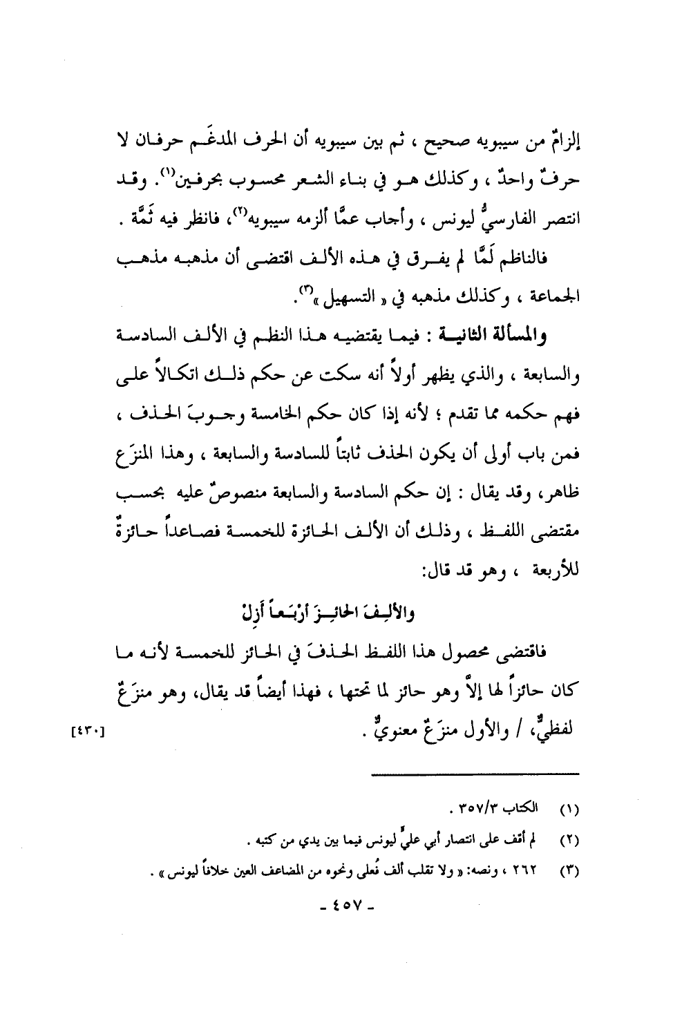إلزامٌ من سيبويه صحيح، ثم بين سيبويه أن الحرف المدغم حرفان لا حرف واحد، وكذلك هو في بناء الشعر مسحوب بحرفين. وقد انتصر الفارسي ليونس، وأجاب عمَّا ألزمه سيبويه، فانظر فيه ثَمَّة.