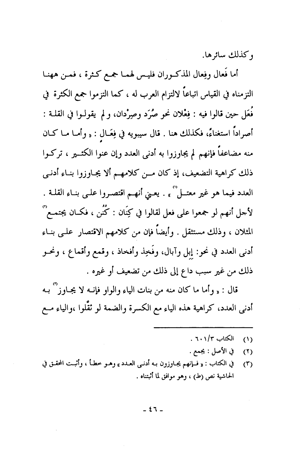 قال: "وأما ما كان منه من بنات الياء والواو فإنه لا يجاوز به أدنى العدد، كراهية هذه الياء مع الكسرة والضمة لو ثقَّلوا، والياء مع