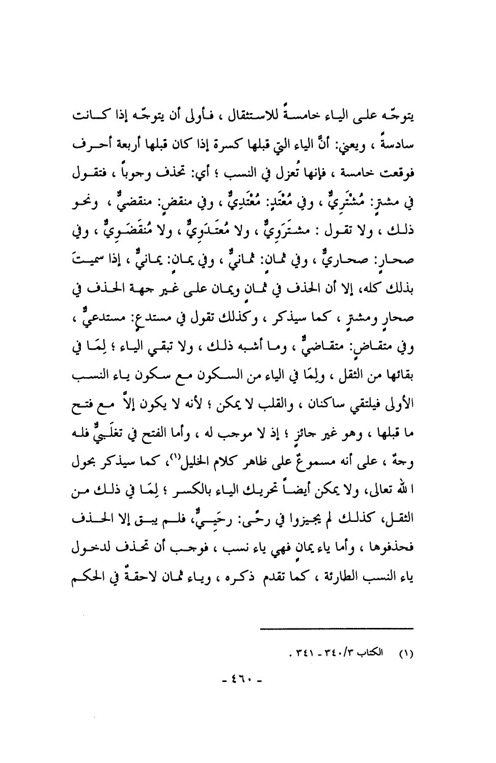 يتوجّه على الياء خامسةً للاستثقال، فأولى أن يتوجّه إذا كانت سادسةً، ويعني: أن الياء التي قبلها كسرة إذا كان قبلها أربعة أحرف فوقعت خامسة، فإنها تُعزل في النسب؛ أي: تحذف وجوباً، فتقول في مشترٍ: مُشْتَرِيٌّ، وفي مُعْتَدٍ: مُعْتَدِيٌّ، وفي منقض: منقضيٌّ، ونحو ذلك، ولا تقول: مشتَرَوِيٌّ، ولا مُعتَدَوِيٌّ، ولا مُنقَضَوِيٌّ، وفي صحارٍ: صحاريٌّ، وفي ثمانٍ: ثمانيٌّ، وفي يمانٍ: يمانيٌّ، إذا سميتَ بذلك كله، إلا أن الحذف في ثمانٍ ويمان على غير جهة الحذف في صحارٍ ومشترٍ، كما سيذكر، وكذلك تقول في مستدعٍ: مستدعيٌّ، وفي متقاضٍ: متقاضيٌّ، وما أشبه ذلك، ولا تبقي الياء؛ لِمَا في بقائها من الثقل، ولِمَا في الياء من السكون مع سكون ياء النسب الأولى فيلتقي ساكنان، والقلب لا يكن؛ لأنه لا يكون إلا مع فتح ما قبلها، وهو غير جائزٍ؛ إذ لا موجب له، وأما الفتح في تغلَبيٌّ فله وجهٌ، على أنه مسموعٌ على ظاهر كلام الخليل، كما سيذكر بحول الله تعالى، ولا يمكن أيضاً تحريك الياء بالكسر؛ لما في ذلك من الثقل، كذلك لم يجيزوا في رحًى: رحَيِيٌّ، فلم يبق إلا الحذف فحذفوها، وأما ياء يمانٍ فهي ياء نسب، فوب أن تحذف لدخول ياء النسب الطارئة، كما تقدم ذكره، وياء ثمان لاحقةٌ في الحكم