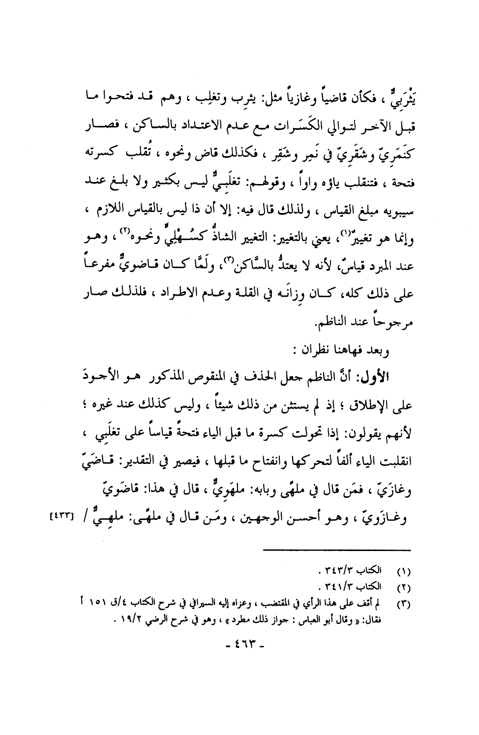 الأول: أن الناظم جعل الحذف في المنقوص المذكور هو الأجود على الإطلاق؛ إذ لم يستثن من ذلك شيئاً، وليس كذلك عند غيره؛ لأنهم يقولون: إذا تحولت كسرة ما قبل الياء فتحةً قياساً على تغلَبِي، انقلبت الياء ألفاً لتحركها وانفتاح ما قبلها، فيصير في التقدير: قاضَيّ وغازَيّ، فمن قال في ملهًى وبابه: ملهَوِيٌّ، قال في هذا: قاضَويّ وغازَويّ، وهو أحسن الوجهين، ومن قال في ملهٍى: ملهِيٌّ /