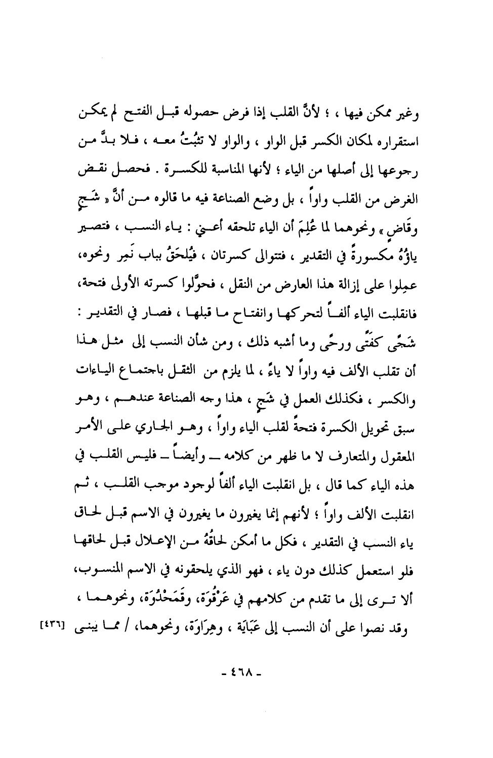 وغير ممكن فيها، ؛ لأن القلب إذا فرض حصوله قبل الفتح لم يمكن استقراره لمكان الكسر قبل الواو، والواو لا تثبت معه، فلا بد من رجوعها إلى أصلها من الياء؛ لأنها المناسبة للكسرة. فحصل نقض الغرض من القلب واواً، بل وضع الصناعة فيه ما قالوه من أنَّ "شجٍّ وقاضٍ" ونحوهما لما عُلِمَ أن الياء تلحقه أعني: ياء النسب، فتصير ياؤه مكسورة في التقدير، فتتوالى كسرتان، فيلحق بباب نَمِر ونحوه، عمِلوا على إزالة هذا العارض من النقل، فحوَّلوا كسرته الأولى فتحة، فانقلبت الياء ألفاً لتحركها وانفتاح ما قبلها، فصار في التقدير شجًى كفتًى ورحًى وما أشبه ذلك، ومن شأن النسب إلى مثل هذا أن تقلب الألف فيه واواً لا ياءً، لما يلزم من الثقل باجتماع الياءات والكسر، فكذلك العمل في شجٍ، هذا وجه الصناعة عندهم، وهو سبق تحويل الكسرة فتحة لقلب الياء واواً، وهو الجاري على الأمر المعقول والمتعارف لا ما ظهر من كلامه - وأيضاً - فليس القلب في هذه الياء كما قال، بل انقلبت الياء ألفاً لوجود موجب القلب، ثم انقلبت الألف واواً؛ لأنهم إنما يغيرون ما يغيرون في الاسم قبل لحاق ياء النسب في التقدير، فكل ما أمكن لحاقُهُ من الإعلال قبل لحاقها فلو استعمل كذلك دون ياء، فهو الذي يلحقونه في الاسم المنسوب، ألا ترى إلى ما تقدم من كلامهم في عَرْقُوَة، وقَمَحْدُوَة، ونحوهما، وقد نصوا على أن النسب إلى عَبَايَة، وهِرَاوَة، ونحوهما، / مما يبنى