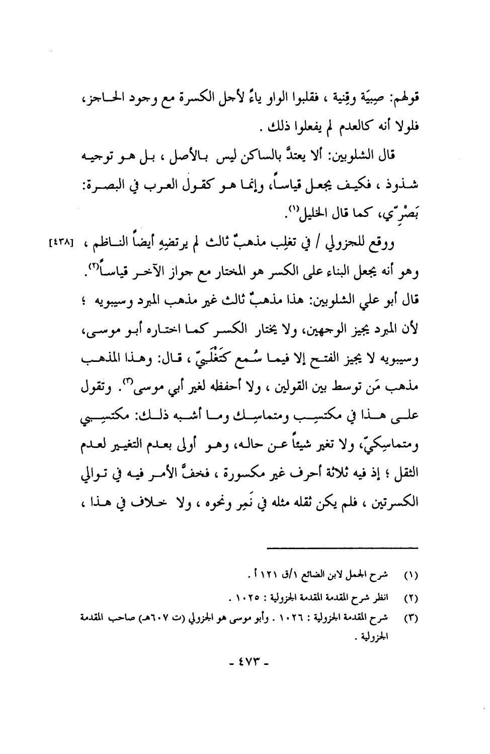 ووقع للجزولي / في تغلِب مذهبٌ ثالث لم يرتضِهِ أيضاً الناظم، وهو أن يجعل البناء على الكسر هو المختار مع جواز الآخر قياساً. قال أبو علي الشلوبين: هذا مذهب ثالث غير مذهب المبرد وسيبويه؛ لأن المبرد يجيز الوجهين، ولا يختار الكسر ما اختاره أبو موسى، وسيبويه لا يجيز الفتح إلا فيما سُمع كتَغْلَبيّ، قال: وهذا المذهب مذهب مَن توسط بين القولين، ولا أحفظه لغير أبي موسى. وتقول على هذا في مكتسب ومتماسك وما أشبه ذلك: مكتسِبي ومتماسِكيّ، ولا تغير شيئاً عن حاله، وهو أولى بعدم التغيير لعدم الثقل؛ إذ فيه ثلاثة أحرف غير مكسور، فخفَّ الأمر فيه في توالي الكسرتين، فل يكن ثقله مثله في نَمِر ونحوه، ولا خلاف في هذا،
