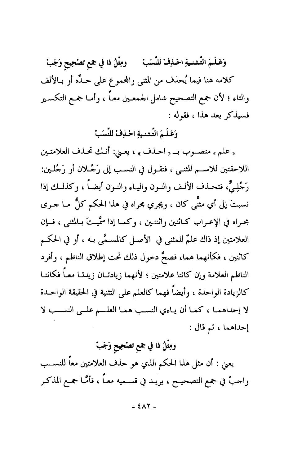 وَعَلَمَ التَّثنيةِ احْذِفْ للنَّسَبْ ومِثلُ ذا في جمعِ تصحيحٍ وَجَبْ