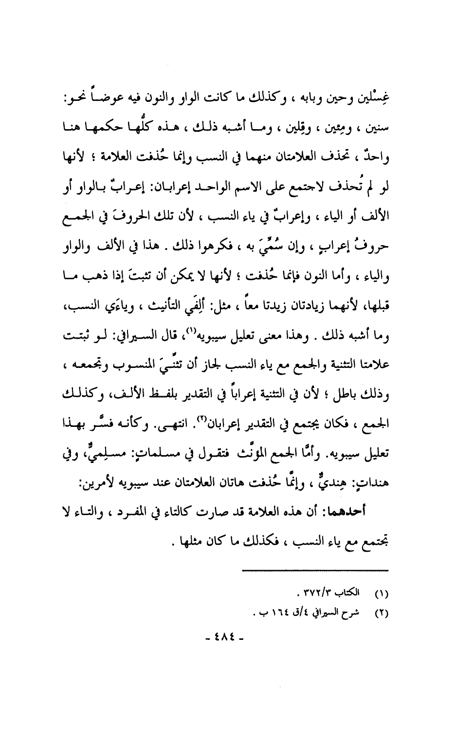 غِسْلين وحين وبابه، وكذلك ما كانت الواو والنون فيه عوضاً نحو: سنين، ومئين، وقِلين، وما أشبه ذلك، هذه كلُّها حكمها هنا واحدٌ، تحذف العلامتان منهما في النسب وإنما حُذفت العلامة؛ لأنها لو لم تُحذف لاجتمع على الاسم الواحد إعرابان: إعرابٌ بالواو أو الألف أو الياء، وإعراب في ياء النسب، لأن تلك الحروف في الجمع حروفُ إعرابٍ، وإن سُمِّيَ به، فكرهوا ذلك. هذا في الألف والواو والياء، وأما النون فإنما حذفت؛ لأنها لا يمكن أن تثبتَ إذا ذهب ما قبلها، لأنهما زيادتان زيدتا معاً، مثل: ألِفَي التأنيث، وياءي النسب، وما أشبه ذلك. وهذا معنى تعليل سيبويه، قال السيرافي: لو ثبتت علامتا التثنية والجمع مع ياء النسب لجاز أن تثنِّيَ المنسوب وتجمعه، وذلك باطل؛ لأن في التثنية إعراباً في التقدير بلفظ الألف، وكذلك الجمع، فكان يجتمع في التقدير إعرابان. انتهى. وكأنه فسَّر بهذا تعليل سيبويه. وأما الجمع المؤنث فتقول في مسلماتٍ: مسلِميٌّ، وفي هندات: هِنديٌّ، وإنما حذفت هاتان العلامتان عند سيبويه لأمرين: