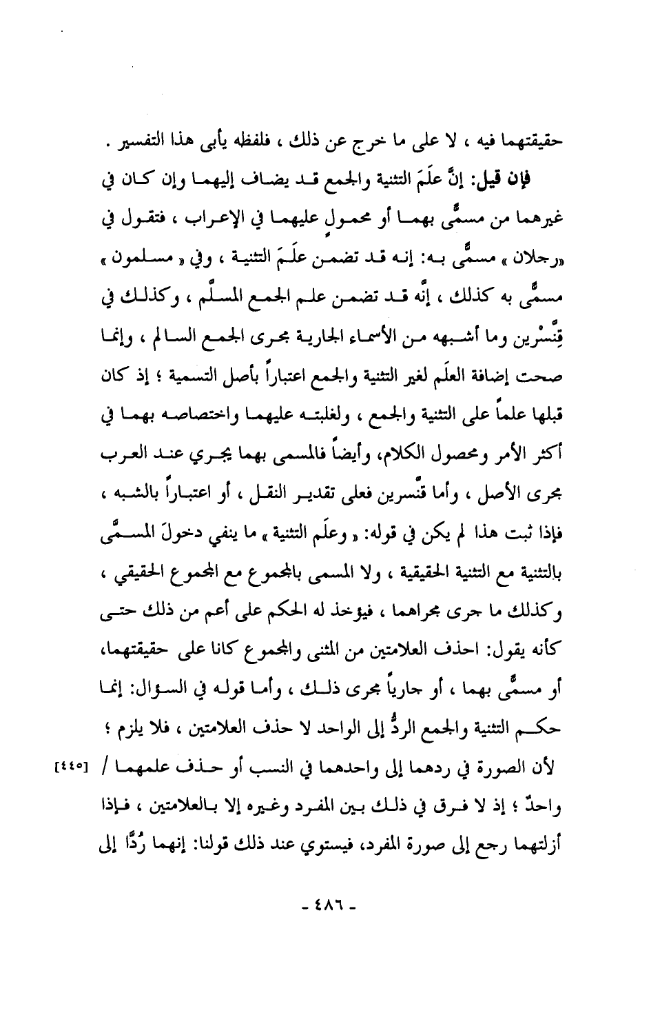 فإن قيل: إنَّ علَمَ التثنية والجمع قد يضاف إليهما وإن كان في غيرهما من مسمًّى بهما أو محمولٍ عليهما في الإعراب، فتقول في "رجلان" مسمًّى به: إنه قد تضمن علم التثنية، وفي "مسلمون" مسمًّى به كذلك، إنه قد تضمن علم الجمع المسلَّم، وكذلك في قِنَّسْرين وما أشبهه من الأسماء الجارية مجرى الجمع السالم، وإنما صحت إضافة العلَم لغير التثنية والجمع اعتباراً بأصل التسمية؛ إذ كان قبلها علماً على التثنية والجمع، ولغلبته عليهما واختصاصه بهما في أكثر الأمر ومحصول الكلام، وأيضاً فالمسمى بهما يجري عند العرب مجرى الأصل، وأما قنَّسرين فعلى تقدير النقل، أو اعتباراً بالشبه، فإذا ثبت هذا لم يكن في قوله: "وعلَم التثنية" ما ينفي دخولَ المسمَّى بالتثنية مع التثنية الحقيقية، ولا المسمى بالمجموع مع المجموع الحقيقي، وكذلك ما جرى مجراهما، فيؤخذ له الحكم على أعم من ذلك حتى كأنه يقول: احذف العلامتين من المثنى والمجموع كانا على حقيقتهما، أو مسمًّى بهما، أو جارياً مجرى ذلك، وأما قوله في السؤال: إنما حكم التثنية والجمع الردُّ إلى الواحد لا حذف العلامتين، فلا يلزم؛ لأن الصورة في ردهما إلى واحدهما في النسب أو حذف علمهما / واحدٌ؛ إذ لا فرق في ذلك بين المفرد وغيره إلا بالعلامتين، فإذا أزلتهما رجع إلى صورة المفرد، فيستوي عند ذلك قولنا: إنهما رُدَّا إلى