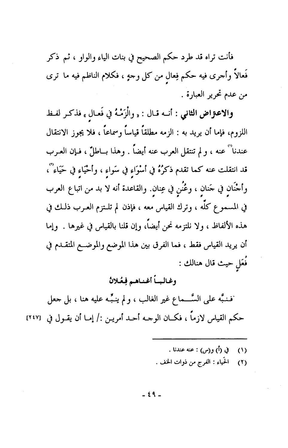 والاعتراض الثاني: أنه قال: "والزمه في فَعالٍ" فذكر لفظ اللزوم، فإما أن يريد به: الزمه مطلقاً قياساً وسماعاً، فلا يجوز الانتقال عندنا عنه، ولم تنتقل العرب عنه أيضاً. وهذا باطلٌ، فإن العرب قد انتقلت عنه كما تقدم ذكره في أسْوَاءٍ في سواء، وأحياءٍ، وأحياءٍ في حياء، وأجْنَانٍ في جَنانٍ، وعُنُنٍ في عِنان. والقاعدة أنه لا بد من اتباع العرب في المسموع كله، وترك القياس معه، فإذن لم تلتزم العرب ذلك في هذه الألفاظ، ولا نلتزمه نحن أيضاً، وإن قلنا بالقياس في غيرها. وإما أن يريد القياس فقط، فما الفرق بين هذا الموضع والموضع المتقدم في فُعَلٍ حيث قال هنالك: