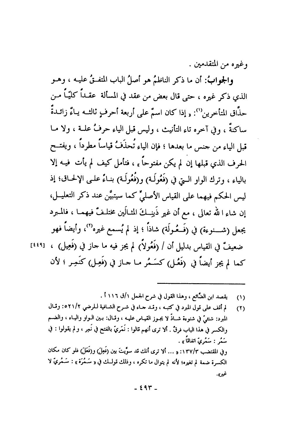 والجوابُ: أن ما ذكر الناظم هو أصل الباب المتفقُ عليه، وهو الذي ذكر غيره، حتى قال بعض من عقد في المسألة عقداً كلياً من حذاق المتأخرين: "إذا كان اسمٌ على أربعة أحرفٍ ثالثه ياءٌ زائدةٌ ساكنةٌ، وفي آخره تاء التأنيث، وليس قبل الياء حرفُ علة، ولا ما قبل الياء من جنس ما بعدها؛ فإن الياء تُحذف قياساً مطرداً، ويفتح الحرف الذي قبلها إن لم يكن مفتوحاً"، فتأمل كيف لم يأت فيه إلا بالياء، وترك الواو التي في (فَعُولَة) و (فُعُولة) بناءً على الإلحاق؛ إذ ليس الحكم فيهما على القياس الأصلي كما سيتبين عند ذكر التعليل، إن شاء الله تعالى، مع أن غير ذَينِكَ المثالين مختلفٌ فيهما، فالمبرد يجعل (شنوءة) في (فَعُولة) شاذاً؛ إذ لم يُسمع غيره، وأيضاً فهو ضعيف في القياس بدليل أن / (فَعُولاً) لم يجز فيه ما جاز في (فَعِيل)، كما لم يجز أيضاً في (فَعُل) كسَمُر ما جاز في (فَعِل) كنَمِر؛ لأن