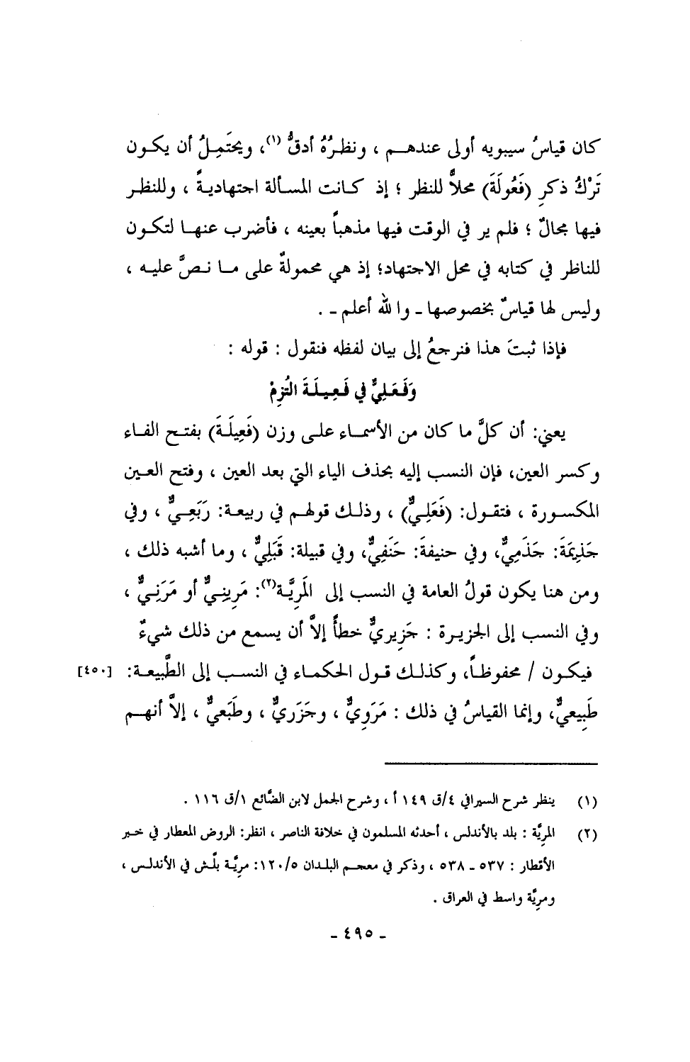 يعني: أن كلَّ ما كان من الأسماء على وزن (فَعِيلَةَ) بفتح الفاء وكسر العين، فإن النسب إليه بحذف الياء التي بعد العين، وفتح العين المكسورة، فتقول: (فَعَلِيٌّ)، وذلك قولهم في ربيعة: رَبَعِيٌّ، وفي جَذِيمَةَ: جَذَمِيٌّ، وفي حنيفة: حَنَفِيٌّ، وفي قبيلة: قَبَلِيٌّ، وما أشبه ذلك، ومن هنا يكون قولُ العامة في النسب إلى المَرِيَّة: مَرِينيٌّ أو مَرَنِيٌّ، وفي النسب إلى الجزيرة: جَزِيريٌّ خطأً إلا أن يسمع من ذلك شيء فيكون / محفوظاً، وكذلك قول الحكماء في النسب إلى الطبيعة: طبيعيٌّ، وإنما القياس في ذلك: مَرَوِيٌّ، وجَزَريٌّ، وطَبَعيٌّ، إلا أنهم