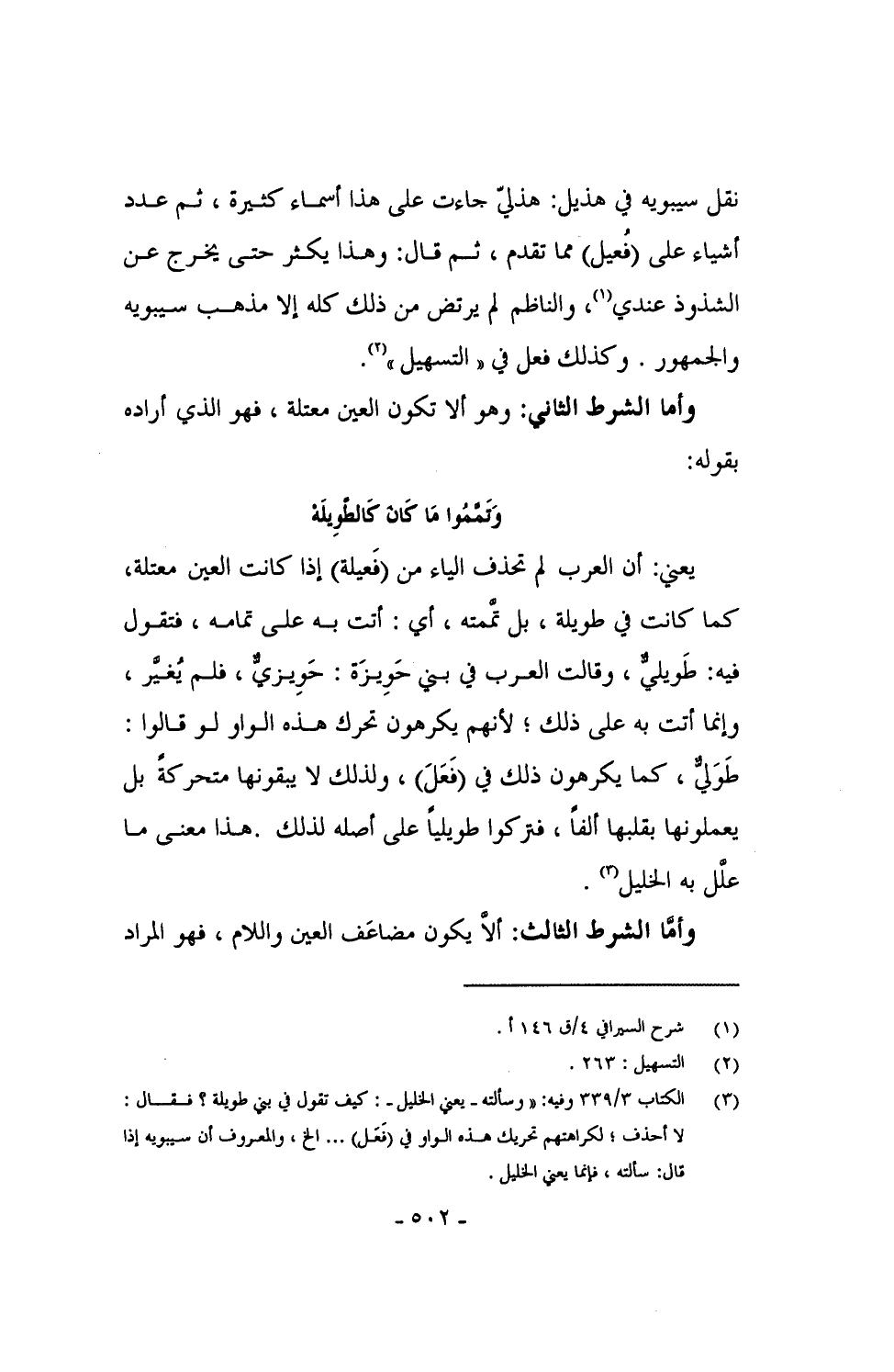 يعني: أن العرب لم تحذف الياء من (فَعيلة) إذا كانت العين معتلة، كما كانت في طويلة، بل تمَّمته، أي: أتت به على تمامه، فتقول فيه: طَويليٌّ، وقالت العرب في بني حَوِيزَة: حَوِيزَة: حَوِيزيٌّ، فلم يُغيَّر، وإنما أتت به على ذلك؛ لأنهم يكرهون تحرك هذه الواو لو قالوا: طَوَليٌّ، كما يكرهون ذلك في (فَعَلَ)، ولذلك لا يبقونها متحركةً بل يعملونها بقلبها ألفاً، فتركوا طويلياً على أصله لذلك. هذا معنى ما علَّل به الخليل.