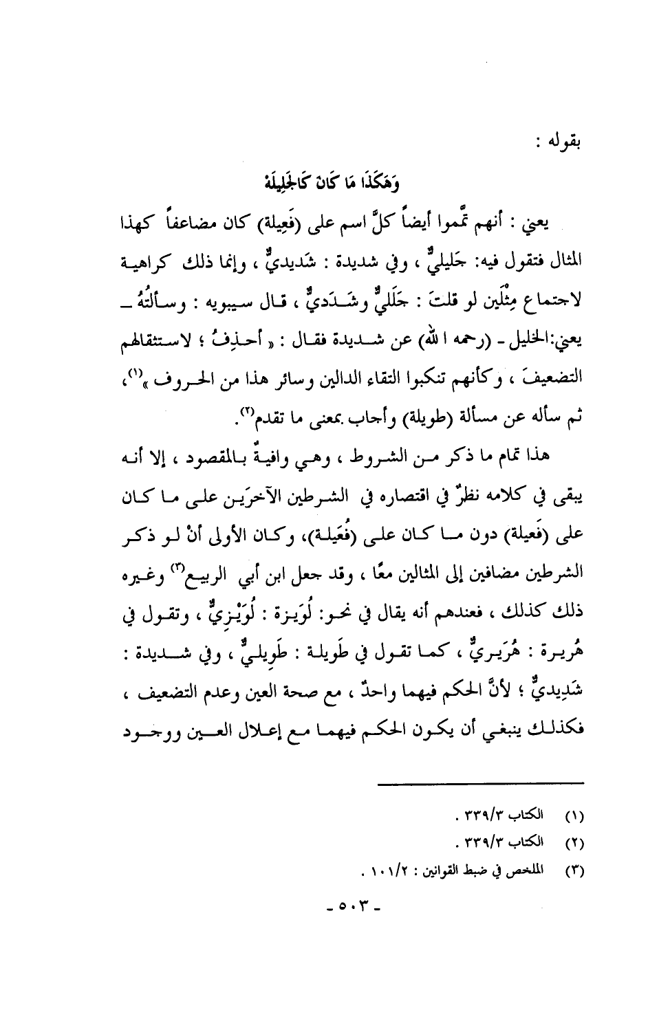 يعني: أنهم تمَّموا أيضاً كل اسم على (فَعِيلة) كان مضاعفاً كهذا المثال فتقول فيه: جَليليٌّ، وفي شديدة: شَديديٌّ، وإنما ذلك كراهية لاجتماع مِثْلَين لو قلتَ: جَلَليٌّ وشَدَديٌّ، قال سيبويه: وسألتُهُ -يعني: الخليل - (رحمه الله) عن شديدة فقال: "أحذِفُ؛ لاستثقالهم التضعيفَ، وكأنهم تنكبوا التقاء الدالين وسائر هذا من الحروف"، ثم سأله عن مسألة (طويلة) وأجاب بمعنى ما تقدم.