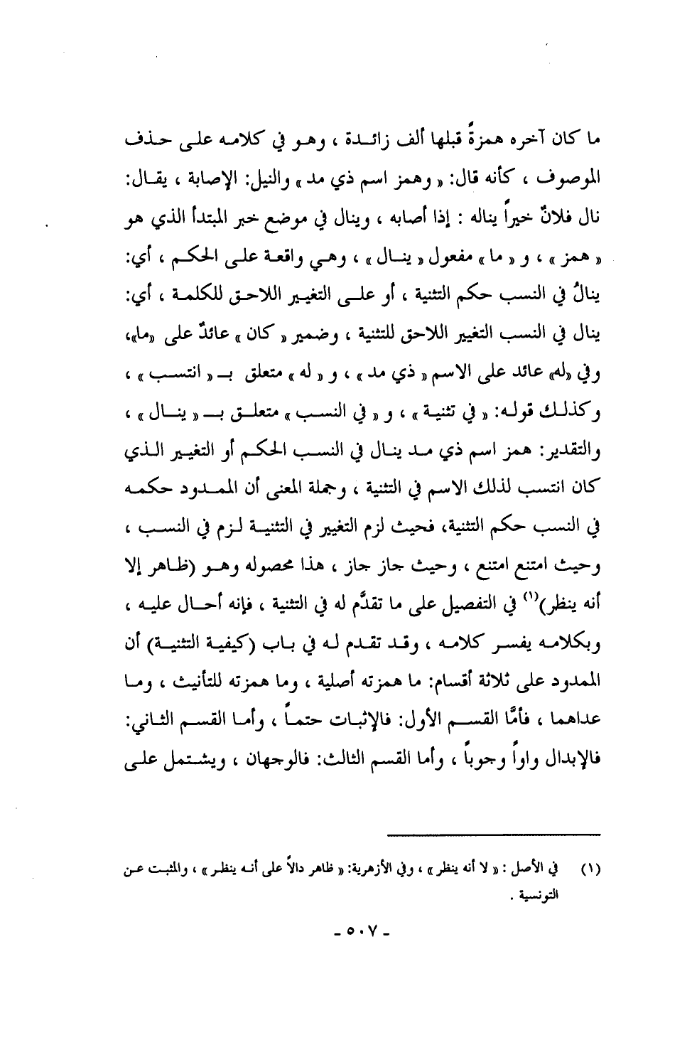 ما كان آخره همزةً قبلها ألف زائدة، وهو في كلامه على حذف الموصوف، كأنه قال: "وهمز اسم ذي مد" والنيل: الإصابة، يقال: نال فلانٌ خيراً يناله: إذا أصابه، وينال في موضع خبر المبتدأ الذي هو "همز"، و"ما" مفعول "ينال"، وهي واقعة على الحكم، أي: ينالُ في النسب حكم التثنية، أو على التغيير اللاحق للكلمة، أي: ينال في النسب التغيير اللاحق للتثنية، وضمير "كان" عائدٌ على "ما"، وفي "له" عائد على الاسم "ذي مد" ينال في النسب الحكم أو التغيير الذي كان انتسب لذلك الاسم في التثنية، وجملة المعنى أن الممدود حكمه في النسب حكم التثنية، فحيث لزم التغيير في التثنية لزم في النسب، وحيث امتنع امتنع، وحيث جاز جاز، هذا محصوله وهو (ظاهر إلا أنه ينظر) في التفصيل على ما تقدم له في التثنية، فإنه أحال عليه، وبكلامه يفسر كلامه، وقد تقدم له في باب (كيفية التثنية) أن الممدود على ثلاثة أقسام: ما همزته أصلية، وما همزته للتأنيث، وما عداهما، فأما القسم الأول: فالإثبات حتماً، وأم القسم الثاني: فالإبدال واواً وجوباً، وأما القسم الثالث: فالوجهان، ويشتمل على