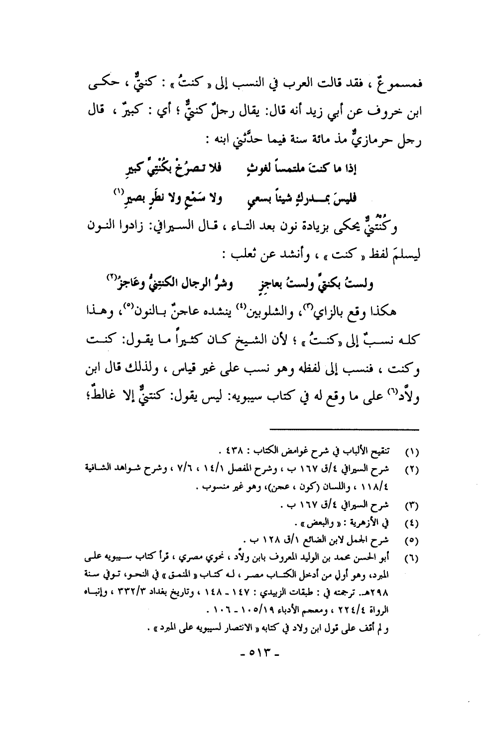 هكذا وقع بالزاي، والشلوبين ينشده عاجنٌ بالنون، وهذا كله نسبٌ إلى "كنتُ"؛ لأن الشيخ كان كثيراً ما يقول: كنت وكنت، فنسب إلى لفظه وهو نسب على غير قياس، ولذلك قال ابن ولاَّد على ما وقع له في كتاب سيبويه: ليس يقول: كنتنيٌّ إلا غالطٌ؛