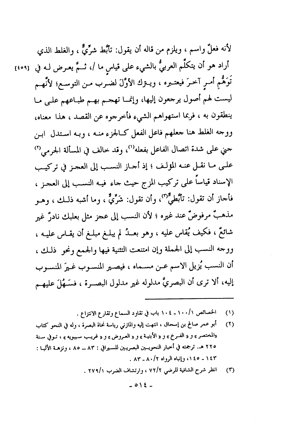 لأنه فعلٌ واسم، ويلزم من قاله أن يقول: تأبَّط شرِّيٌّ، والغلط الذي أراد هو أن يتكلم العربي بالشيء على قياسٍ ما /، ثمَّ يعرض له في توهُّمِ أمرٍ آخر فيعتبره، ويترك الأول لضرب من التوسع؛ لأنهم ليست لهم أصول يرجعون إليها، وإنما تهجم بهم طباعهم على ما ينطقون به، فربما استهواهم الشيء فأخرجوه عن القصد، هذا معناه، ووجه الغلط هنا جعلهم فاعل الفعل كالجزء منه، وبه استدل ابن جني على شدة اتصال الفاعل بفعله، وقد خالف في المسألة الجرمي على ما نقل عنه المؤلف؛ إذ أجاز النسب إلى العجز في تركيب الإسناد قياساً على تركيب المزج حيث جاء فيه النسب إلى العجز، فأجاز أن تقول: تأبَّطيٌّ، وأن تقول: شَرِّيٌّ، وما أشبه ذلك، وهو مذهبٌ مرفوضٌ عند غيره؛ لأن النسب إلى عجز مثل بعلبك نادرٌ غير شائعٌ، فكيف يقاس عليه، وهو بعدُ لم يبلغ مبلغ أن يقاس عليه، ووجه النسب إلى الجملة وإن امتنعت التثنية فيها والجمع ونحو ذلك، أن النسب يزيل الاسم عن مسماه، فيصير المنسوب غير المنسوب إليه، ألا ترى أن البصريَّ مدلوله غير مدلول البصرة، فسَهُلَ عليهم