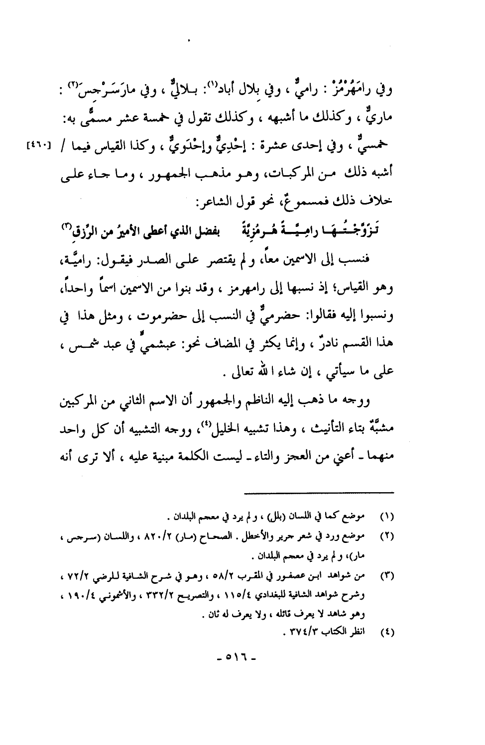 فنسب إلى الاسمين معاً، ولم يقتصر على الصدر فيقول: راميَّة، وهو القياس؛ إذ نسبها إلى رامهرمز، وقد بنوا من الاسمين اسماً واحداً، ونسبوا إليه فقالوا: حضرميٌّ في النسب إلى حضرموت، ومثل هذا في هذا القسم نادر، وإنما يكثر في المضاف نحو: عبشميٍّ في عبد شمس، على ما سيأتي، إن شاء الله تعالى.