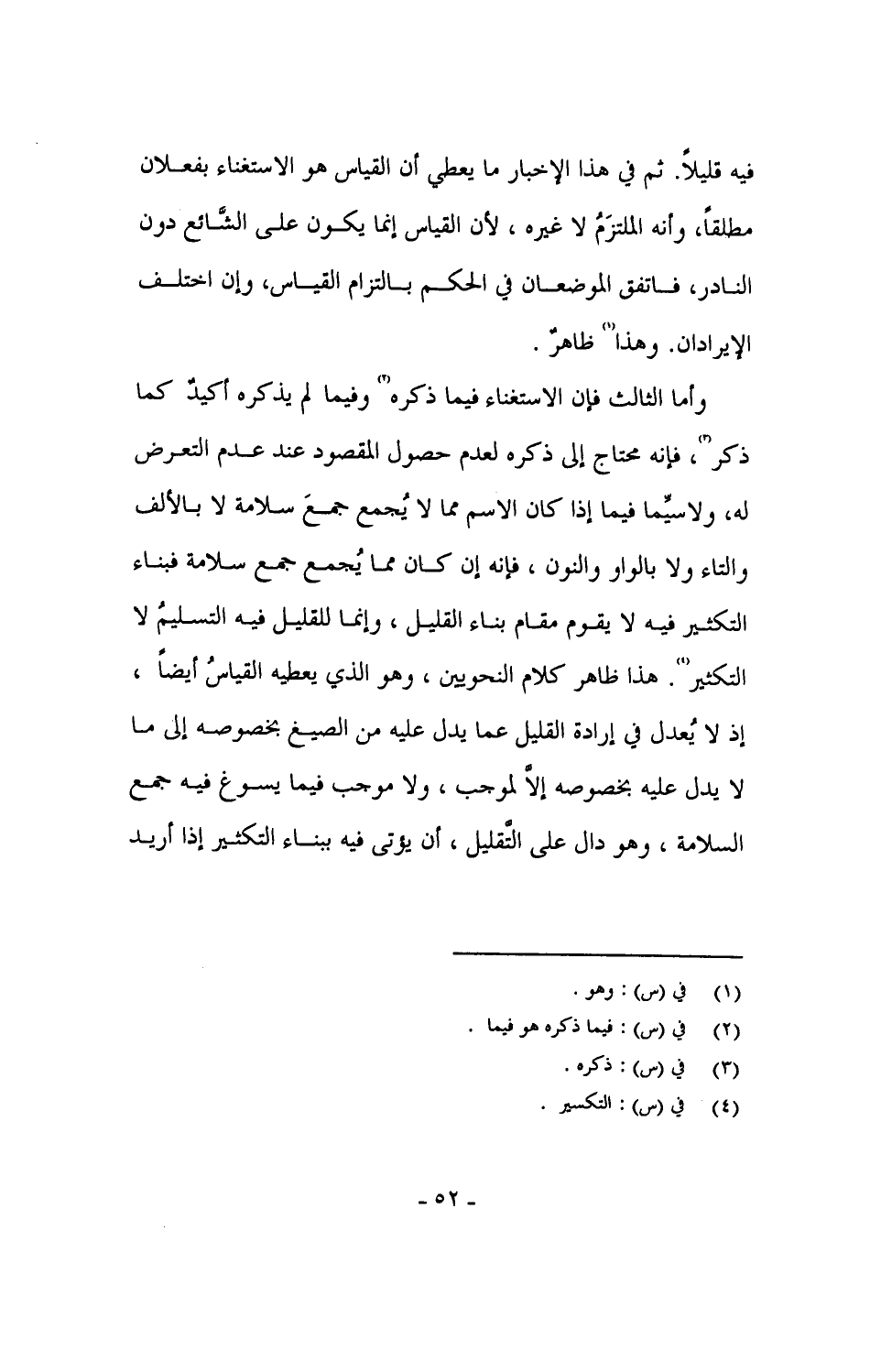 وأما الثالث فإن الاستغناء فيما ذكره وفيما لم يذكره أكيدٌ كما ذكر، فإنه يحتاج إلى ذكره لعدم حصول المقصود عند عدم التعرض له، ولا سيما فيما إذا كان الاسم مما يُجمع جمعَ سلامة لا بالألف والتاء ولا بالواو والنون، فإنه إن كان مما يجمع جمع سلامة فبناء التكثير فيه لا يقوم مقام بناء القليل، وإنما للقليل فيه التسليم لا التكثير. هذا ظاهر كلام النحويين، وهو الذي يعطيه القياس أيضاً، إذ لا يُعدل في إرادة القليل عما يدل عليه من الصيغ بخصوصه إلى ما لا يدل عليه بخصوصه إلا لموجب، ولا موجب فيما يسوغ فيه جمع السلامة، وهو دال على التقليل، أن يؤتى فيه ببناء التكثير إذا أريد