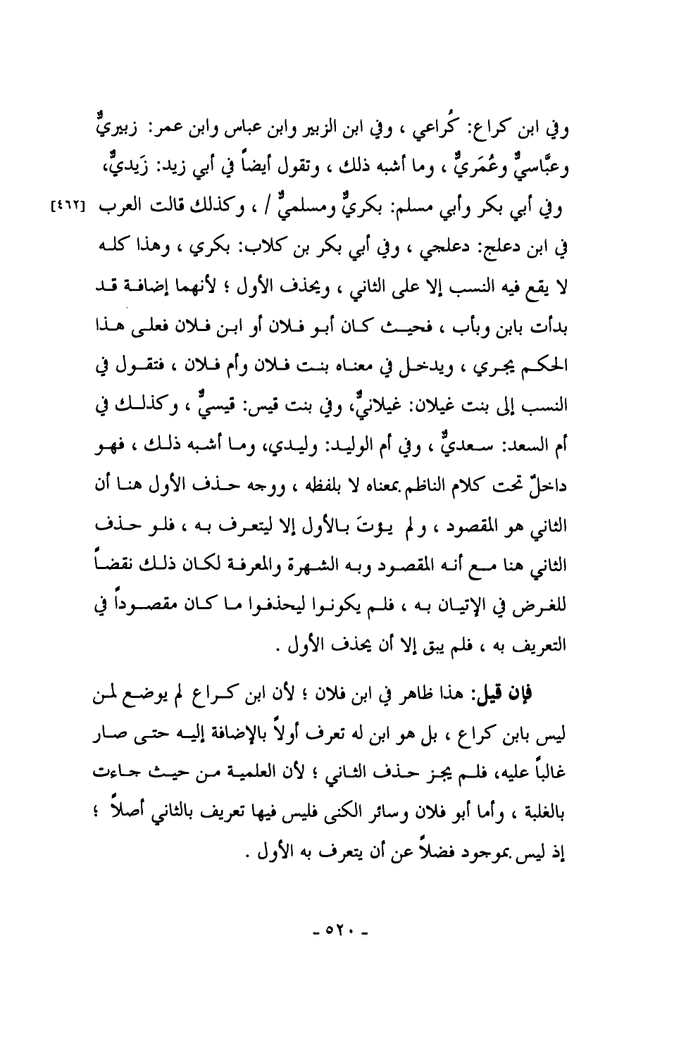 فإن قيل: هذا ظاهر في ابن فلان؛ لأن ابن كراع لم يوضع لمن ليس بابن كراع، بل هو ابن له تعرف أولاً بالإضافة إليه حتى صار غالباً عليه؛ فلم يجز حذف الثاني؛ لأن العلمية من حيث جاءت بالغلبة، وأما أبو فلان وسائر الكنى فليس فيها تعريف بالثاني أصلاً؛ إذ ليس بموجود فضلاً عن أن يتعرف به الأول.