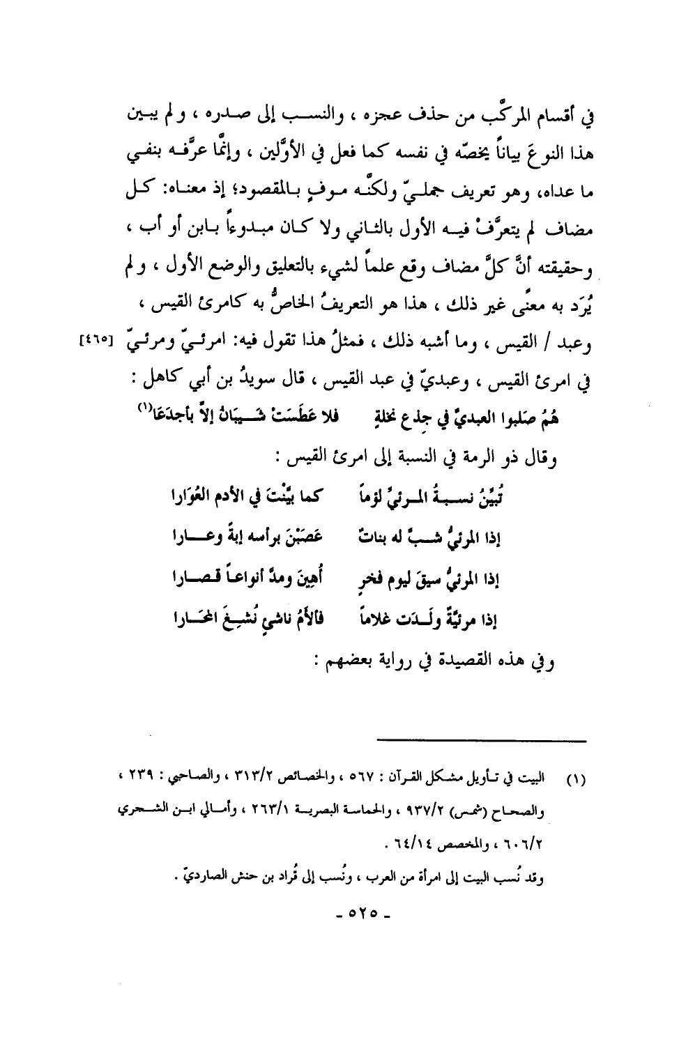 في أقسام المركب من حذف عجزه، والنسب إلى صدره، ولم يبين هذا النوع بياناً يخصه في نفسه كما فعل في الأولين، وإنما عرفه بنفي ما عداه، وهو تعريف جملي ولكنه موفٍ بالمقصود؛ إذ معناه: كل مضاف لم يتعرَّفْ فيه الأول بالثاني ولا كان مبدوءاً بابن أو أب، وحقيقته أن كل مضاف وقع علماً لشيء بالتعليق والوضع الأول، ولم يُرَد له معنًى غير ذلك، هذا هو التعريف الخاص به كامرئ القيس، وعبد / القيس، وما أشبه ذلك، فمثلُ هذا تقول فيه: امرئيّ ومرئيّ في امرئ القيس، وعبديّ في عبد القيس، قال سويد بن أبي كاهل: