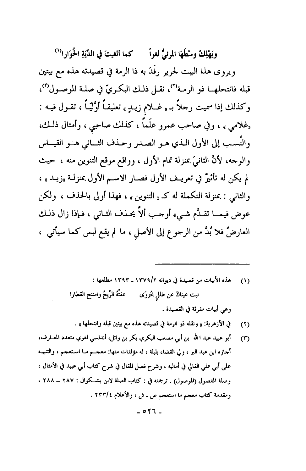 ويروى هذا البيت لجرير رَفَدَ به ذا الرمة في قصيدته هذه مع بيتين قبله فانتحلها ذو الرمة، نقل ذلك البكري في صلة الموصول، وكذلك إذا سميت رجلاً بـ"غلامِ زيدٍ" تعليقاً أولياً، تقول فيه: "غلامي"، وفي صاحب عمرو علَماً، كذلك صاحبي، وأمثال ذلك، والنسب إلى الأول الذي هو الصدر وحذف الثاني هو القياس والوجه، لأن الثاني بمنزلة تمام الأول، وواقع موقع التنوين منه، حيث لم يكن له تأثير في تعريف الأول فصار الاسم الأول بمنزلة "زيد"، والثاني: بمنزلة التكملة له كـ"تنوين"، فهذا أولى بالحذف، ولكن عوض فيما تقدم شيء أوجب ألا يحذف الثاني، فإذا زال ذك العارض فلا بُدَّ من الرجوع إلى الأصلِ، ما لم يقع لبس كما سيأتي،