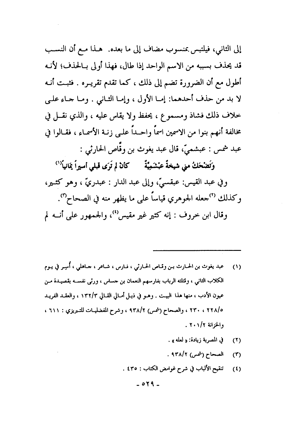 إلى الثاني، فيلتبس بمنسوب مضاف إلى ما بعده. هذا مع أن النسب قد يحذف بسببه من الاسم الواحد إذا طال، فهذا أولى بالحذف؛ لأنه أطول مع أن الضرورة تضم إلى ذلك، كما تقدم تقريره. فثبت أنه لا بد من حذف أحدهما: إما الأول، وإما الثاني. وما جاء على خلاف ذلك فشاذ ومسموع، يحفظ ولا يقاس عليه، والذي نقل في مخالفة أنهم بنوا من الاسمين اسماً واحداً على زنة الأسماء، فقالوا في عبد شمس: عبشميّ، قال عبد يغوث بن وقَّاص الحارثي: