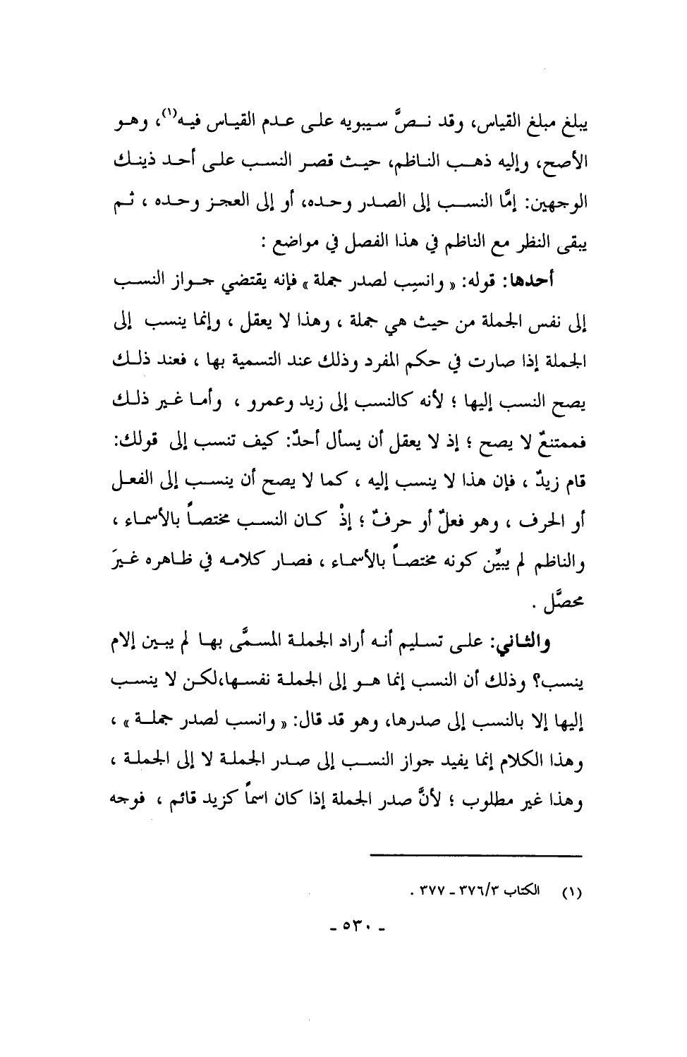 والثاني: على تسليم أنه أراد الجملة المسمَّى بها لم يبين إلام ينسب؟ وذلك أن النسب إنما هو إلى الجملة نفسها، لكن لا ينسب إليها إلا بالنسب إلى صدرها، وهو قد قال: "وانسب لصدر جملة"، وهذا الكلام إنما يفيد جواز النسب إلى صدر الجملة لا إلى الجملة، وهذا غير مطلوب؛ لأنَّ صدر الجملة إذا كان اسماً كزيد قائم، فوجه