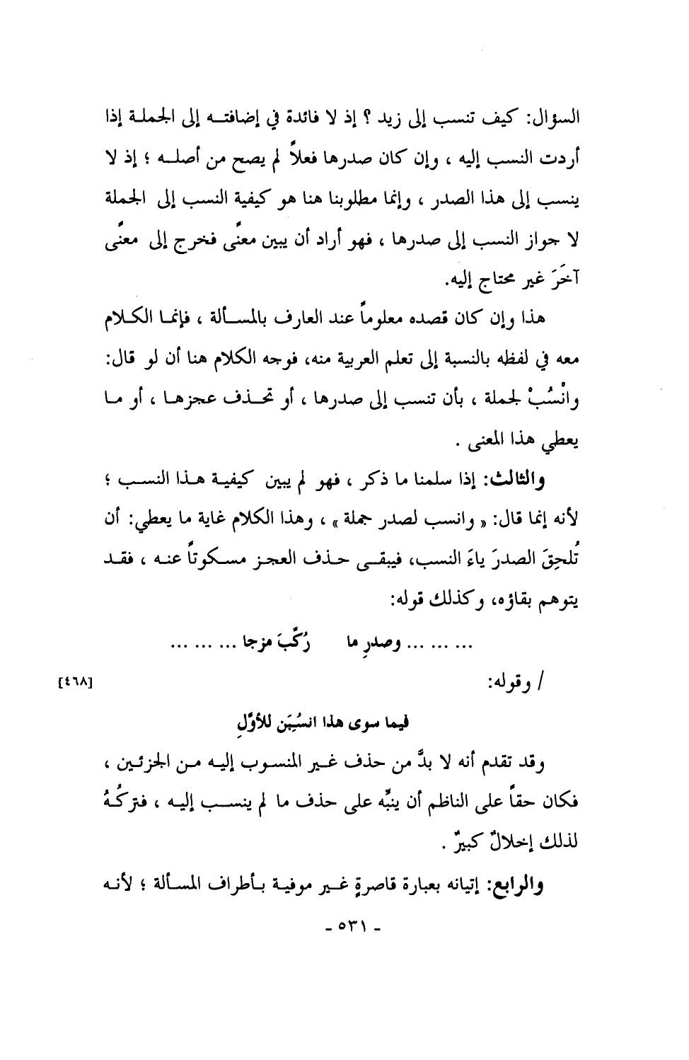 والثالث: إذا سلمنا ما ذكر، فهو لم يبين كيفية هذا النسب؛ لأنه إنما قال: "وانسب لصدر جملة"، وهذا الكلام غاية ما يعطي: أن تُلحِقَ الصدرَ ياءَ النسب، فيبقى حذف العجز مسكوتاً عنه، فقد يتوه بقاؤه، وكذلك قوله:
