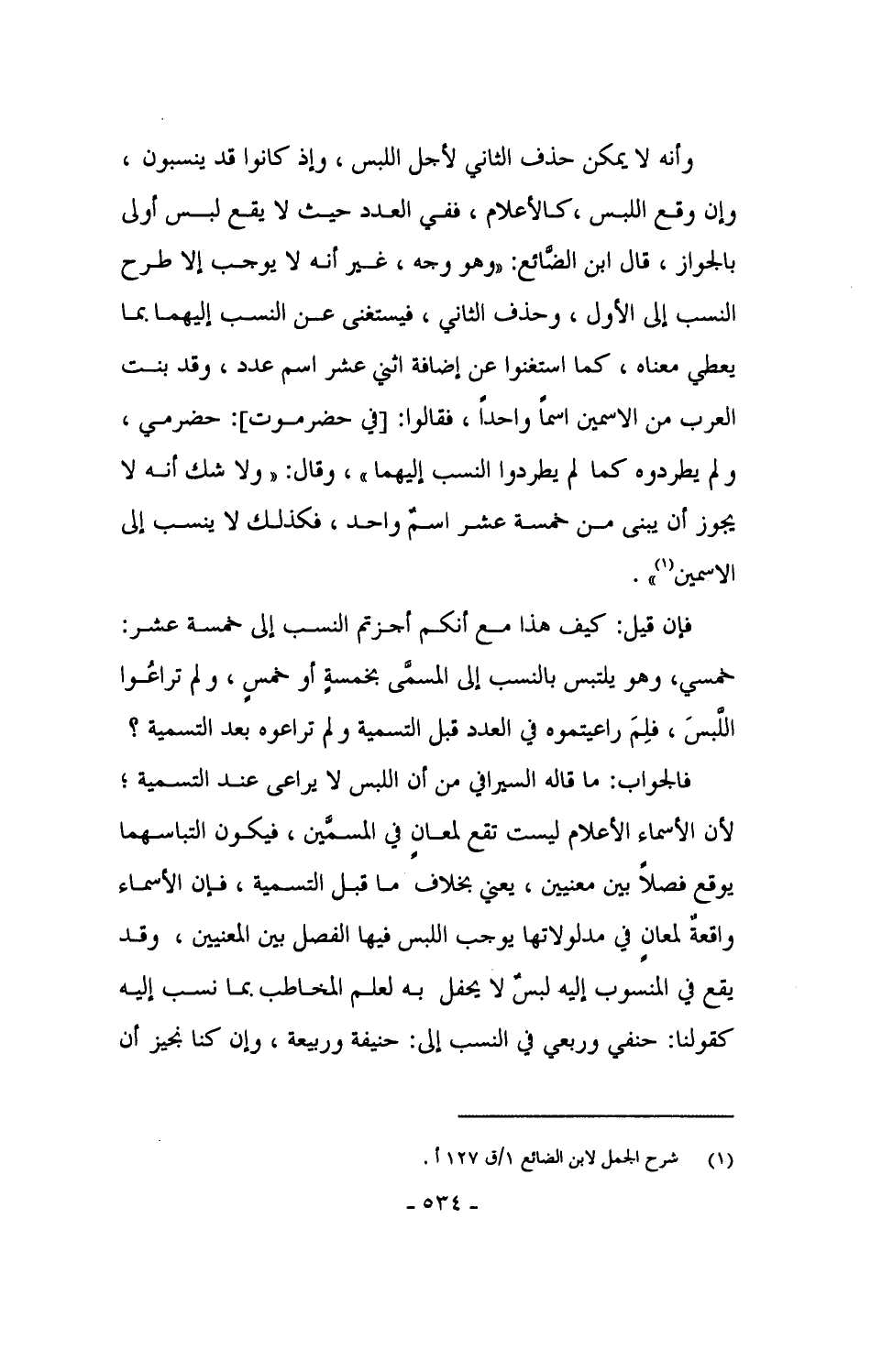 وأنه لا يمكن حذف الثاني لأجل اللبس، وإذ كانوا قد ينسبون، وإن وقع اللبس، كالأعلام، ففي العدد حيث لا يقع لبس أولى بالجواز، قال ابن الضائع: "وهو وجه، غير أنه لا يوجب إلا طرح النسب إلى الأول، وحذف الثاني، فيستغنى عن النسب إليهما بما يعطي معناه، كما استغنوا عن إضافة اثني عشر اسم عدد، وقد بنت العرب من الاسمين اسماً واحداً، فقالوا: [في حضرموت]: حضرمي، ولم يطردوه كما لم يطردوا النسب إليهما"، وقال: "ولا شك أنه لا يجوز أن يبنى من خمسة عشر اسمٌ واحد، فكذلك لا ينسب إلى الاسمين".