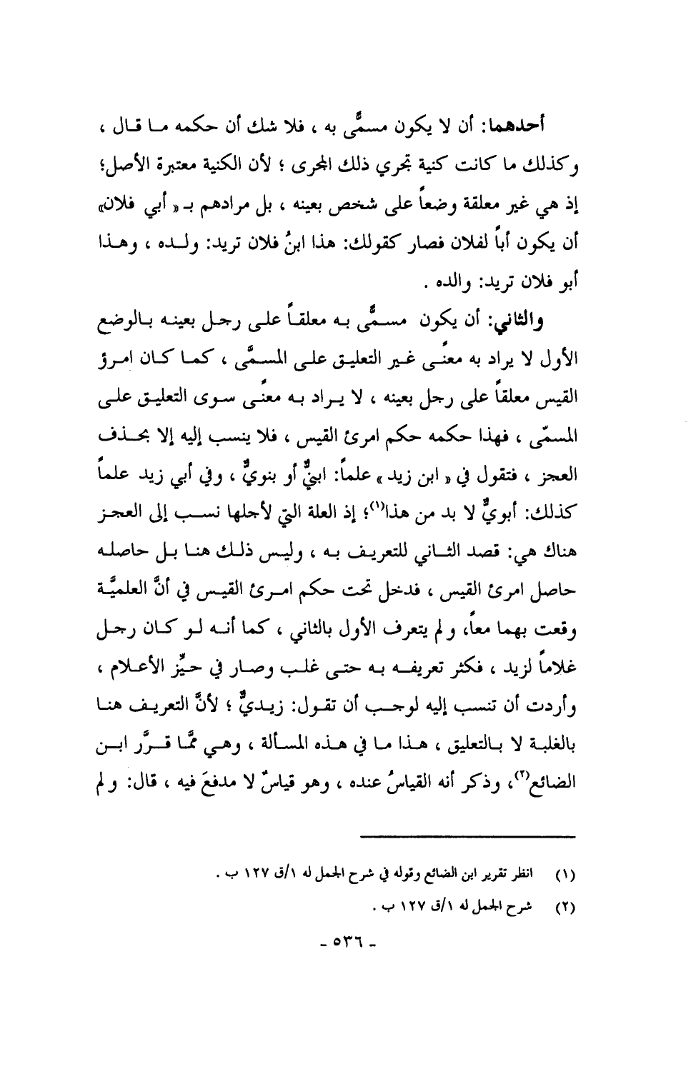 أحدهما: أن لا يكون مسمًّى به، فلا شك أن حكمه ما قال، وكذلك ما كانت كنية تجري ذلك المجرى؛ لأن الكنية معتبرة الأصل؛ إذ هي غير معلقة وضعاً على شخص بعينه، بل مرادهم بـ"أبي فلان" أن يكون أباً لفلان فصار كقولك: هذا ابنُ فلان تريد: ولده، وهذا أبو فلان تريد: والده.