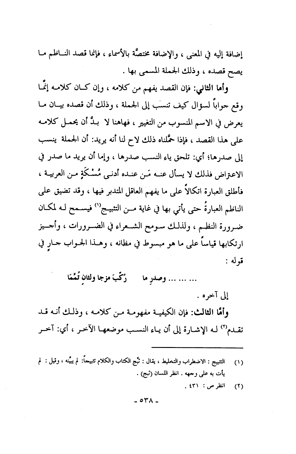 وأما الثاني: فإن القصد يفهم من كلامه، وإن كان كلامه إنما وقع جواباً لسؤال كيف تنسب إلى الجملة، وذلك أن قصده بيان ايعرض في الاس المنسوب من التغيير، فهاهنا لا بدَّ أن يحمل كلامه على هذا القصد، فإذا حمَّلناه ذلك لاح لنا أنه يريد: أن الجملة ينسب إلى صدرها؛ أي: تلحق ياء النسب صدرها، وإما أن يريد ما صدر في الاعتراض فذلك لا يسأل عنه مَن عنده أدنى مُسْكَةٍ من العربية، فأطلق العبارة اتكالاً على ما يفهم العاقل المتدبر فيها، وقد تضيق على الناظم العبارة حتى يأتي بها في غاية من التثبيج فيسمح له لمكان ضرورة النظم، ولذلك سومح الشعراء في الضرورات، وأجيز ارتكابها قياساً على ما هو مبسوط في مظانه، وهذا الجواب جارٍ في قوله: