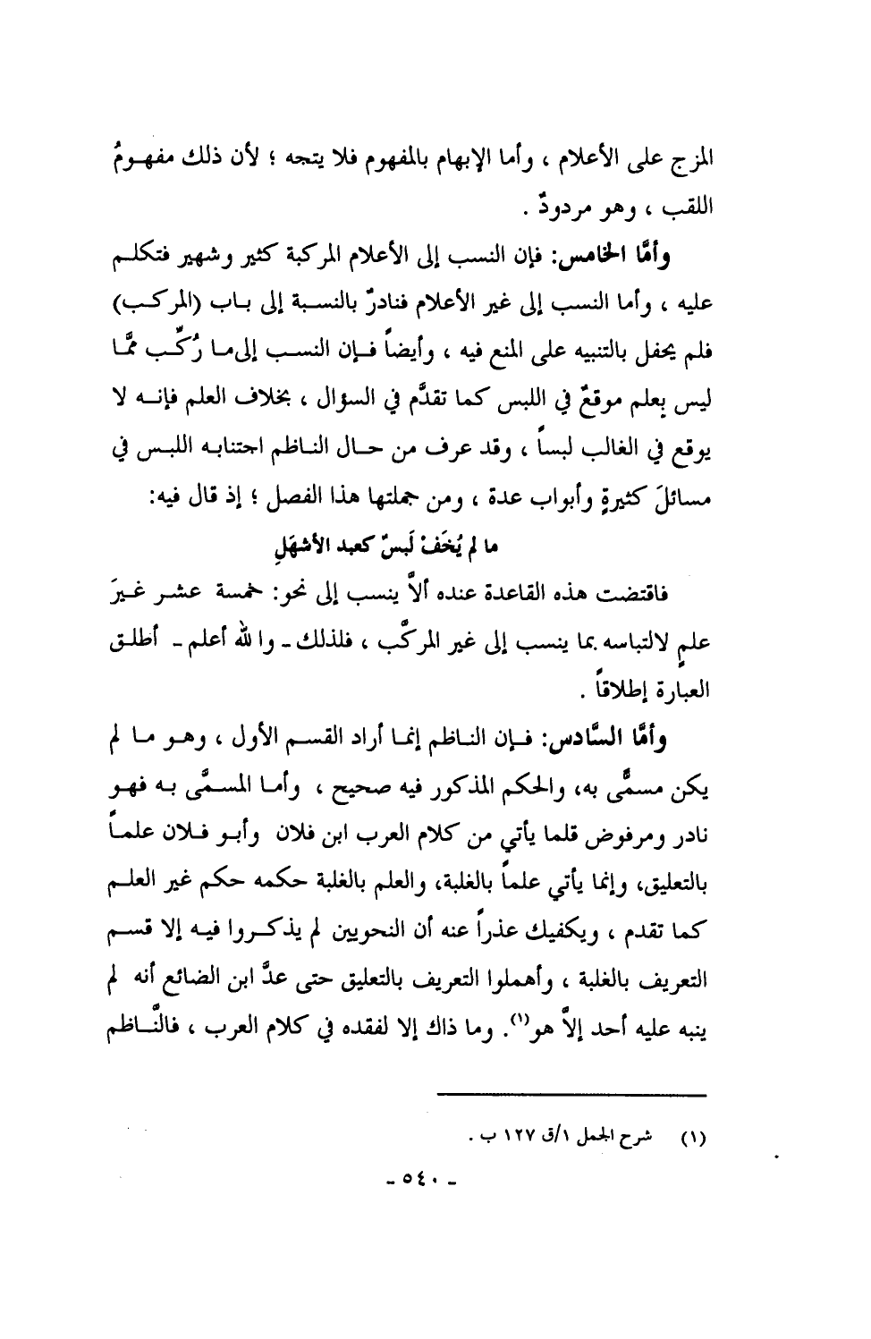 وأما السادس: فإن الناظم إنما أراد القسم الأول، وهو ما لم يكن مسمَّى به، والحكم المذكور فيه صحيح، وأما المسمَّى به فهو نادرٌ ومرفوض قلما يأتي من كلام العرب ابن فلان وأبو فلان علماً بالتعليق، وإنما يأتي علماً بالغلبة، والعلم بالغلبة حكمه حكم غير العلم كما تقدم، ويكفيك عذراً عنه أن النحويين لم يذكروا فيه إلا قسم التعريف بالغلبة، وأهملوا التعريف بالتعليق حتى عدَّ ابن الضائع أنه لم ينبه عليه أحد إلا هو. وما ذاك إلا لفقده في كلام العرب، فالناظم