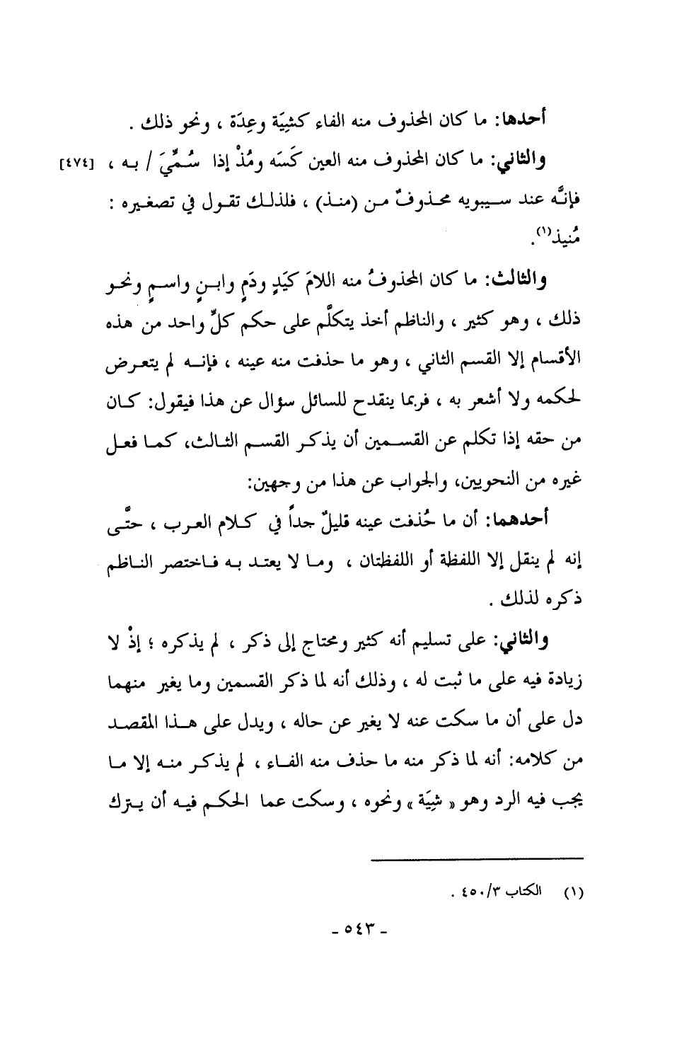 والثالث: ما كان المحذوفُ منه اللامَ كيدٍ ودَمٍ وابنٍ واسمٍ ونحو ذلك، وهو كثير، والناظم أخذ يتكلم على حكم كل واحد من هذه الأقسام إلا القسم الثاني، وهو ما حذفت منه عينه، فإنه لم يتعرض لحكمه ولا أشعر به، فربما ينقدح للسائل سؤال عن هذا فيقول: كان من حقه إذا تكلم عن القسمين أن يذكر القسم الثالث، ما فعل غيره من النحويين، والجواب عن هذا من وجهين: