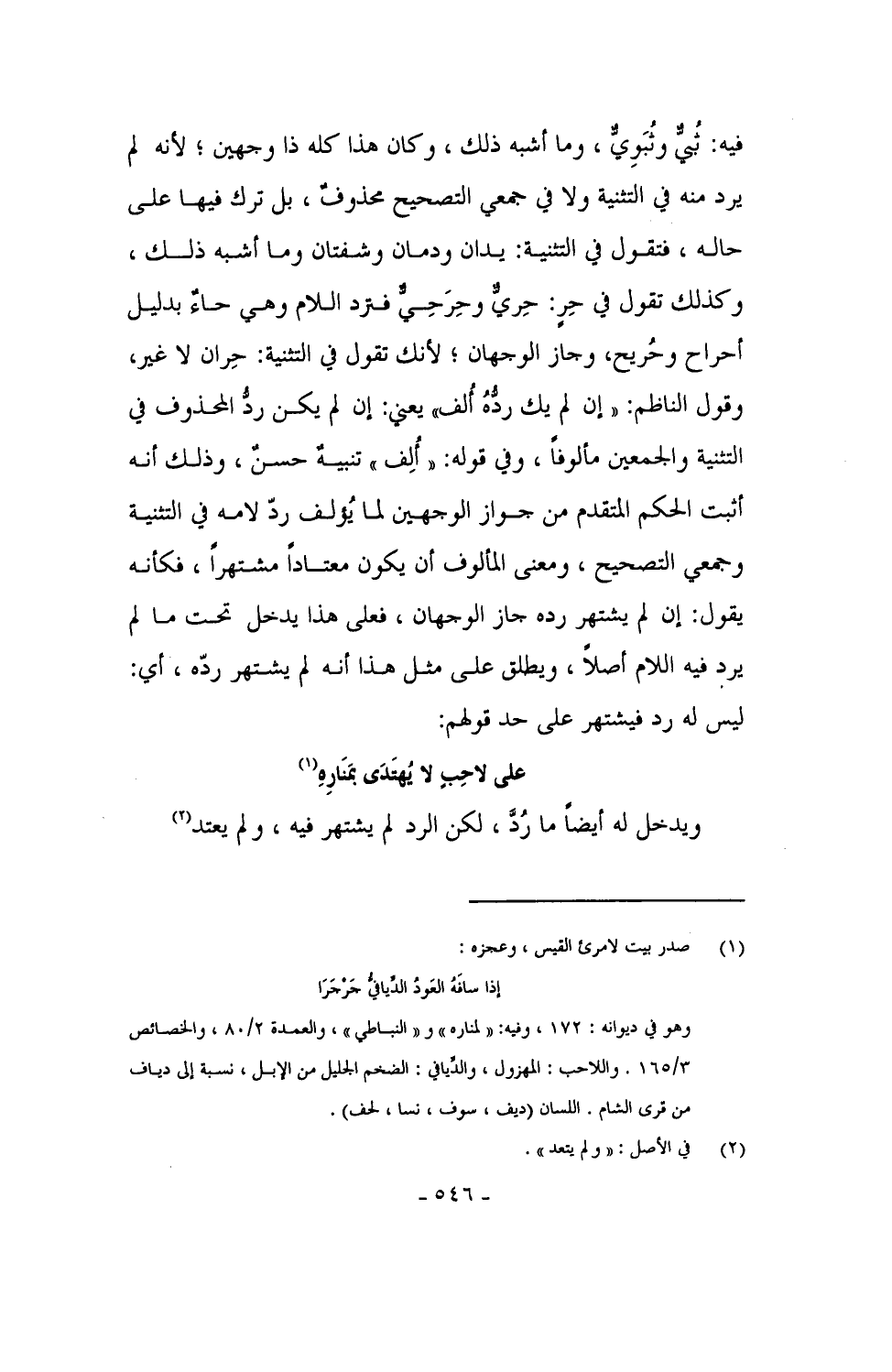 فيه: ثُبيٌّ وثُبَويٌّ، وما أشبه ذلك، وكان هذا كله ذا وجهين؛ لأنه لم يرد منه في التثنية ولا في جمعي التصحيح محذوفٌ، بل ترك فيها على حاله، فتقول في التثنية: يدان ودمان وشفتان وما أشبه ذلك، وكذلك تقول في حِرٍ: حِريٌّ وحِرَحِيٌّ فترد اللام وهي حاءٌ بدليل أحراح وحُريح، وجاز الوجهان؛ لأنك تقول في التثنية: حِران لا غير، وقول الناظم: "إن لم ردُّهُ أُلف" يعني: إن لك يكن رد المحذوف في التثنية والجمعين مألوفاً، وفي قوله: "أُلِف" تنبيهٌ حسنٌ، وذلك أنه أثبت الحكم المتقدم من جواز الوجهين لما يُؤلف ردّ لامه في التثنية وجمعي التصحيح، ومعنى المألوف أن يكون معتاداً مشتهراً، فكأنه يقول: إن لم يشتهر رده جاز الوجهان، فعلى هذا يدخل تحت ما لم يرد فيه اللام أصلاً، ويطلق على مثل هذا أنه لم يشتهر رده، أي: ليس له رد فيشتهر على حد قولهم: