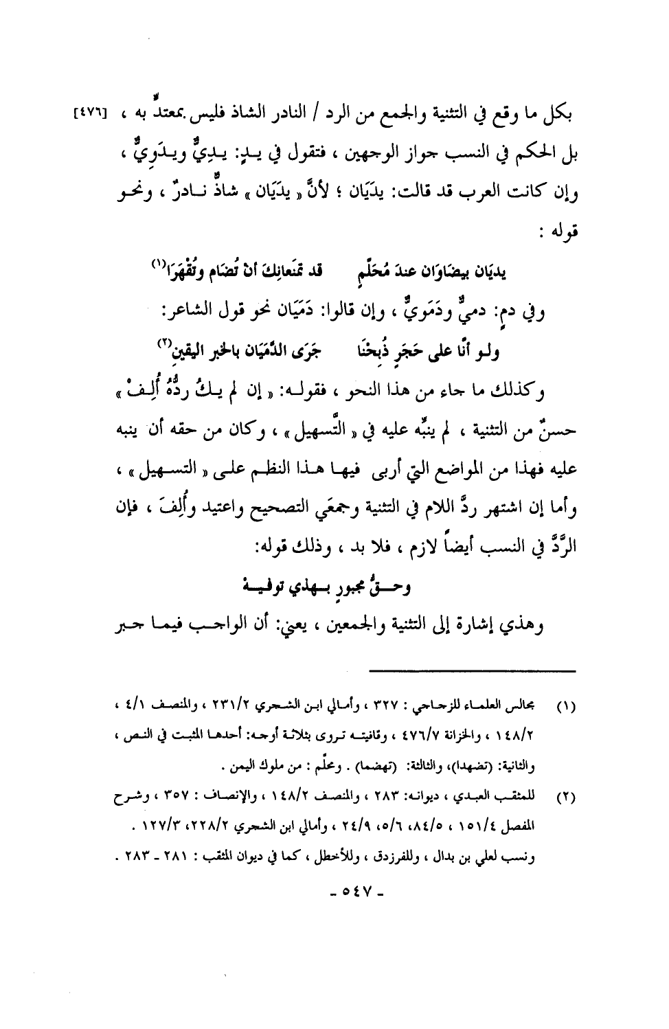 بكل ما وقع في التثنية والجمع من الرد / النادر الشاذ فليس بمعتدٍّ به، بل الحكم في النسب جواز الوجهين، فتقول في يدٍ: يدِيٌّ ويدَوِيٌّ، وإن كانت العرب قد قالت: يدَيَان؛ لأن "يديان" شاذٌّ نادرٌ، ونحو قوله: