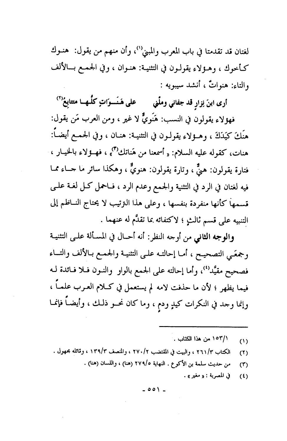 فهؤلاء يقولون في النسب: هَنَويٌّ لا غير، ومن العرب مَن يقول: هَنكَ كيدَكَ، وهؤلاء يقولون في التثنية: هنان، وفي الجمع أيضاً: هنات، كقوله عليه السلام: "أسمعنا من هَناتك"، فهؤلاء بالخيار، فتارة يقولون: هنيٌّ، وتارة يقولون: هنويٌّ، وهكذا سائر ما جاء مما فيه لغتان في الرد في التثنية والجمع وعدم الرد، فاحمل كل لغة على قسمها كأنها منفردة بنفسها، وعلى هذا الترتيب لا يحتاج الناظم إلى التنبيه على قسمٍ ثالث؛ لاكتفائه بما تقدَّم له عنها.