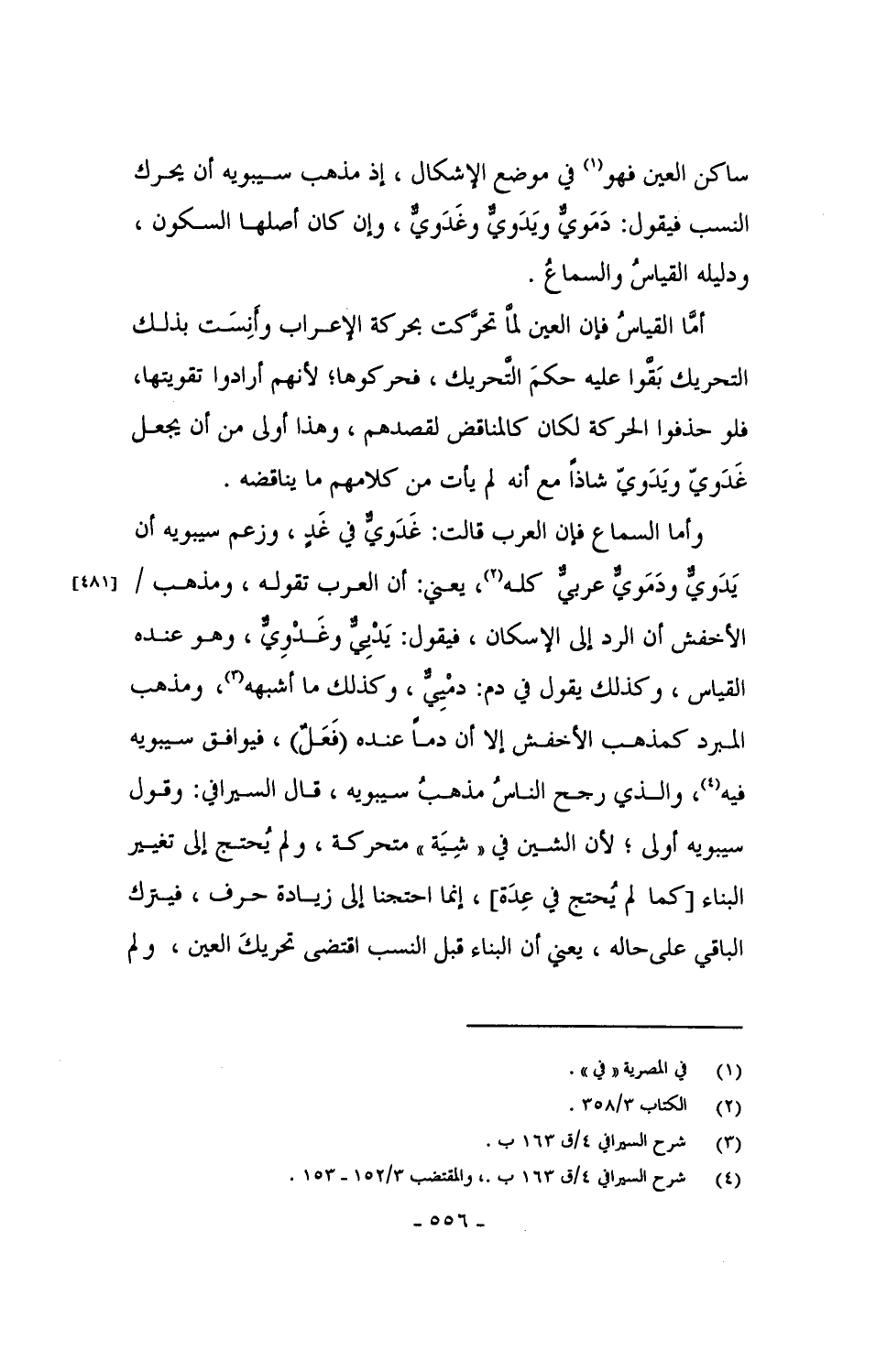 أما القياسُ فإن العين لما تحرَّكت بحركة الإعراب وأَنِسَت بذلك التحريك بَقَّوا عليه حكمَ التحريك، فحركوها؛ لأنهم أرادوا تقويتها، فلو حذفوا الحركة لكان كالمناقض لقصدهم، وهذا أولى من أن يجعل غَدَويّ ويَدَويّ شاذاً مع أنه لم يأت من كلامهم ما يناقضه.
