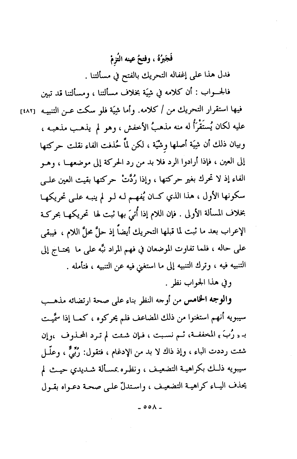 والوجه الخامس من أوجه النظر بناء على صحة ارتضائه مذهب سيبويه أنهم استغنوا من ذلك المضاعف فلم يحركوه، كما إذا سمَّيت بـ"رُبَ" المخففة، ثم نسبت، فإن شئت لم ترد المحذوف، وإن شئت رددت الباء، وإذ ذاك لا بد من الإدغام، فتقول: رُبِّيٌّ، وعلّل سيبويه ذلك بكراهية التضعيف، ونظره بمسألة شديدي حيث لم يحذف الياء كراهية التضعيف، واستدلّ على صحة دعواه بقول