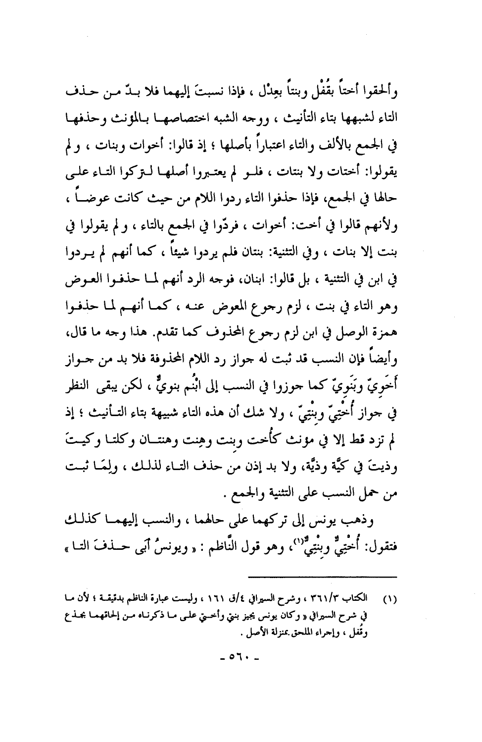 وذهب يونس إلى تركهما على حالهما، والنسب إليهما كذلك فتقول: أُخْتِيٌّ وبِنْتِيٌّ، وهو قول الناظم: "ويونسُ أبَى حذفَ التا"