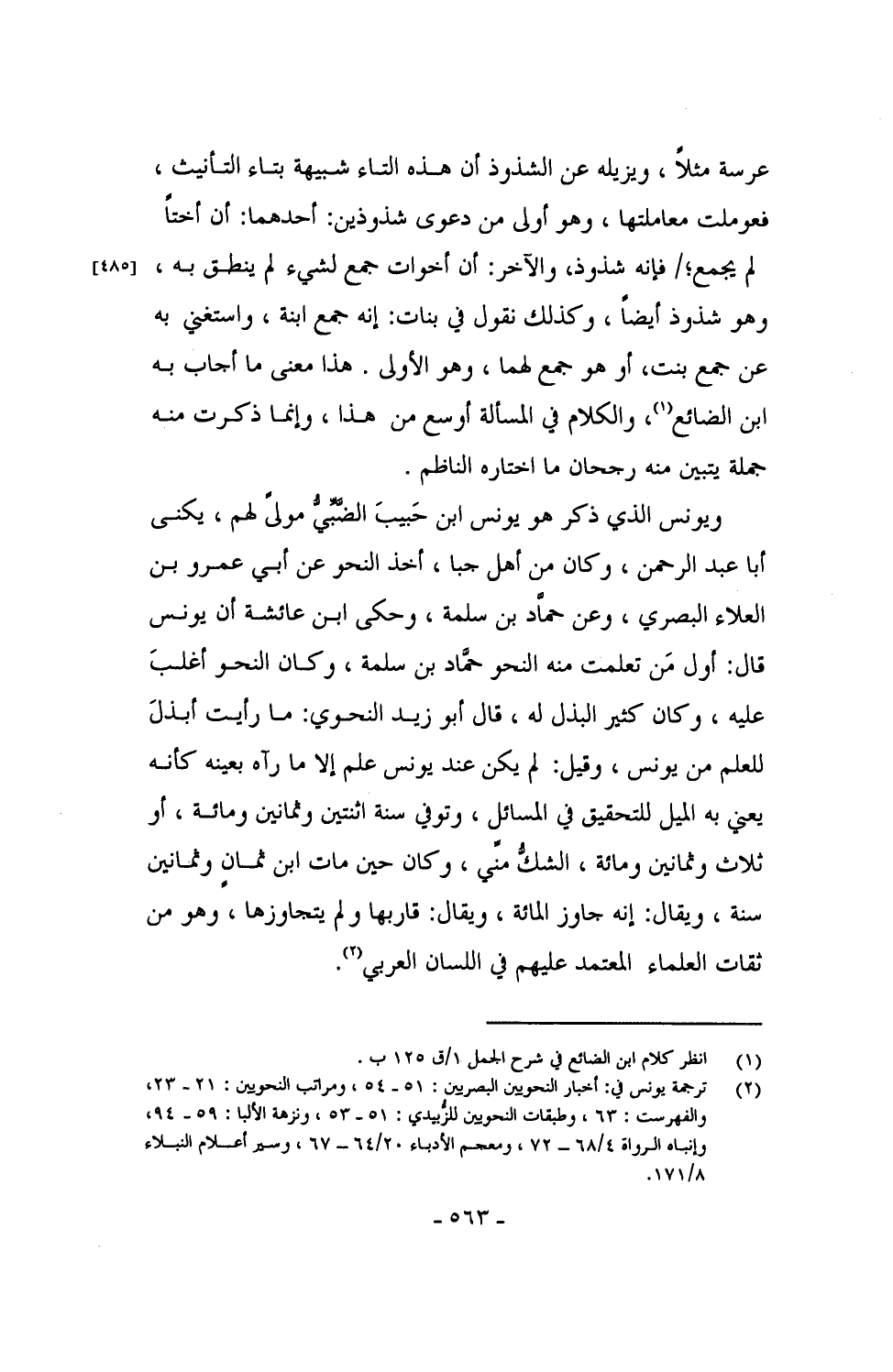 ويونس الذي ذكر هو يونس ابن حَبيبَ الضَّبِّيُّ مولىً لهم، يكنى أبا عبد الرحمن، وكان من أهل جبا، أخذ النحو عن أبي عمرو بن العلاء البصري، وعن حمَّاد بن سلمة، وحكى ابن عائشة أن يونس قال: أول مَن تعلمت منه النحو حمَّاد بن سلمة، وكان النحو أغلبَ عليه، وكان كثير البذل له، قال أبو زيد النحوي: ما رأيت أبذلَ للعلم من يونس، وقيل: لم يكن عند يونس علم إلا ما رآه بعينه كأنه يعني به الميل للتحقيق في المسائل، وتوفي سنة اثنتين وثمانين ومائة، أو ثلاث وثمانين ومائة، الشكُّ مني، وكان حين مات ابن ثمانٍ وثمانين سنة، ويقال: إنه جاوز المائة، ويقال: قاربها ولم يتجاوزها، وهو من ثقات العلماء المعتمد عليهم في اللسان العربي.