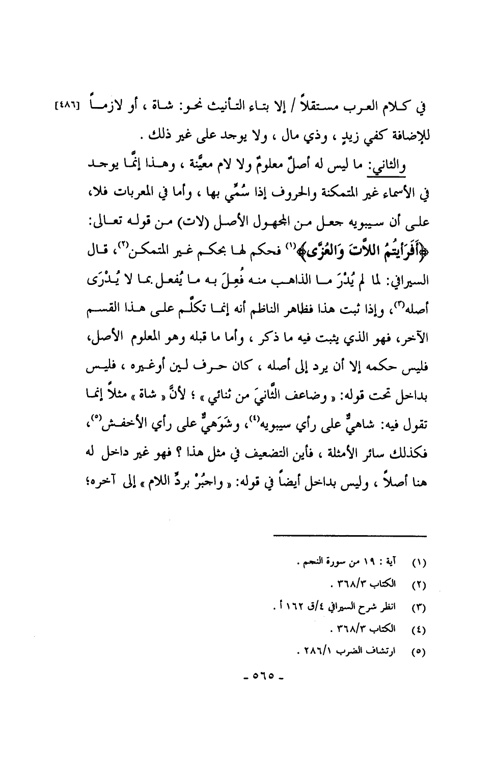 والثاني: ما ليس له أصل معلومٌ ولا لام معيَّنة، وهذا إنما يوجد في الأسماء غير المتمكنة والحروف إذا سُمِّيَ بها، وأما في المعربات فلا، على أن سيبويه جعل من المجهول الأصل (لات) من قوله تعالى: {أفرأيتم اللات والعُزَّى} فحكم لها بحكم غير المتمكن، قال السيرافي: لما لم يُدْرَ ما الذاهب منه فُعِلَ به ما يُفعل بما لا يُدْرَى أصله، وإذا ثبت هذا فظاهر الناظم أنه إنما تكلَّم على هذا القسم الآخر، فهو الذي يثبت فيه ما ذكر، وأما ما قبله وهو المعلوم الأصل، فليس حكمه إلا أن يرد إلى أصله، كان حرف لين أو غيره، فليس بداخل تحت قوله: "وضاعف الثانيَ من ثنائي"؛ لأنَّ "شاة" مثلاً إنما تقول فيه: شاهيٌّ على رأي سيبويه، وشَوَهيٌّ على رأي الأخفش، فكذلك سائر الأمثلة، فأين التضعيف في مثل هذا؟ فهو غير داخل له هنا أصلاً، وليس بداخل في قوله: "واجبُرْ بردِّ اللام" إلى آخره؛