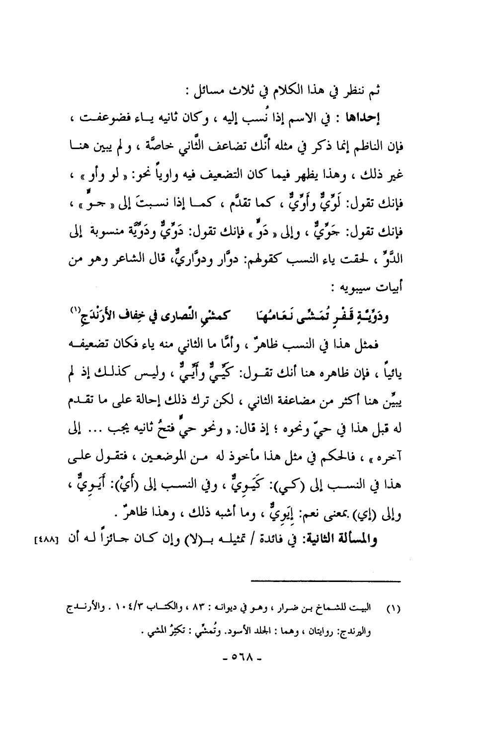 إحداها: في الاسم إذا نُسب إليه، وكان ثانيه ياء فضوعفت، فإن الناظم إنما ذكر في مثله أنَّك تضاعف الثاني خاصة، ولم يبين هنا غير ذلك، وهذا يظهر فيما كان التضعيف فيه واوياً نحو: "لو وأو"، فإنك تقول: لَوِّيٌّ وأَوِّيٌّ، كما تقدم، كما إذا نسبتَ إلى "جوٍّ"، فإنك تقول: جَوِّيٌّ، وإلى "دَوٍّ" فإنك تقول: دَوِّيٌّ ودَويَّة منسوبة إلى الدَّوِّ، لحقت ياء النسب كقولهم: دوَّار ودوَّاريٌّ، قال الشاعر وهو من أبيات سيبويه: