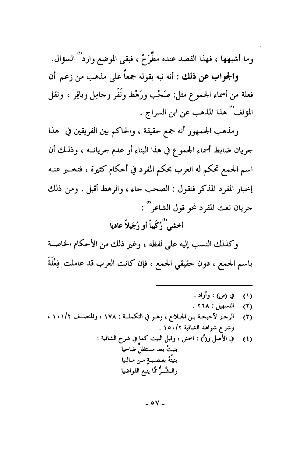 ومذهب الجمهور أنه جمع حقيقة، والحاكم بين الفريقين في هذا جريان ضابط أسماء الجموع في هذا البناء أو عدم جريانه، وذلك أن اسم الجمع تحكم له العرب بحكم المفرد في أحكام كثيرة، فتخبر عنه إخبار المفرد المذكر فتقول: الصحب جاء، والرهط أقبل، ومن ذلك جريان نعت المفرد نحو قول الشاعر: