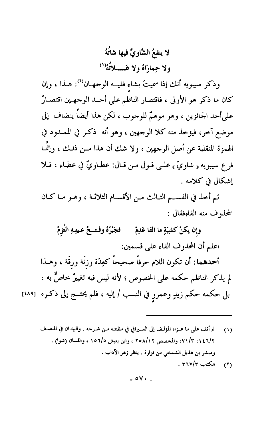 وذكر سيبويه أنك إذا سميتَ بشاءٍ ففيه الوجهان: هذا، وإن كان ما ذكر هو الأولى، فاقتصار الناظم على أحد الوجهين اقتصارٌ على أحد الجائزين، وهو موهمٌ للوجوب، لكن هذا أيضاً ينضاف إلى موضع آخر، فيؤخذ منه كلا الوجهين، وهو أنه ذكر في الممدود في الهمزة المنقلبة عن أصل الوجهين، ولا شك أن هذا من ذلك، وإنما فرع سيبويه "شاويّ" على قول من قال: عطاويّ في عطاء، فلا إشكال في كلامه.