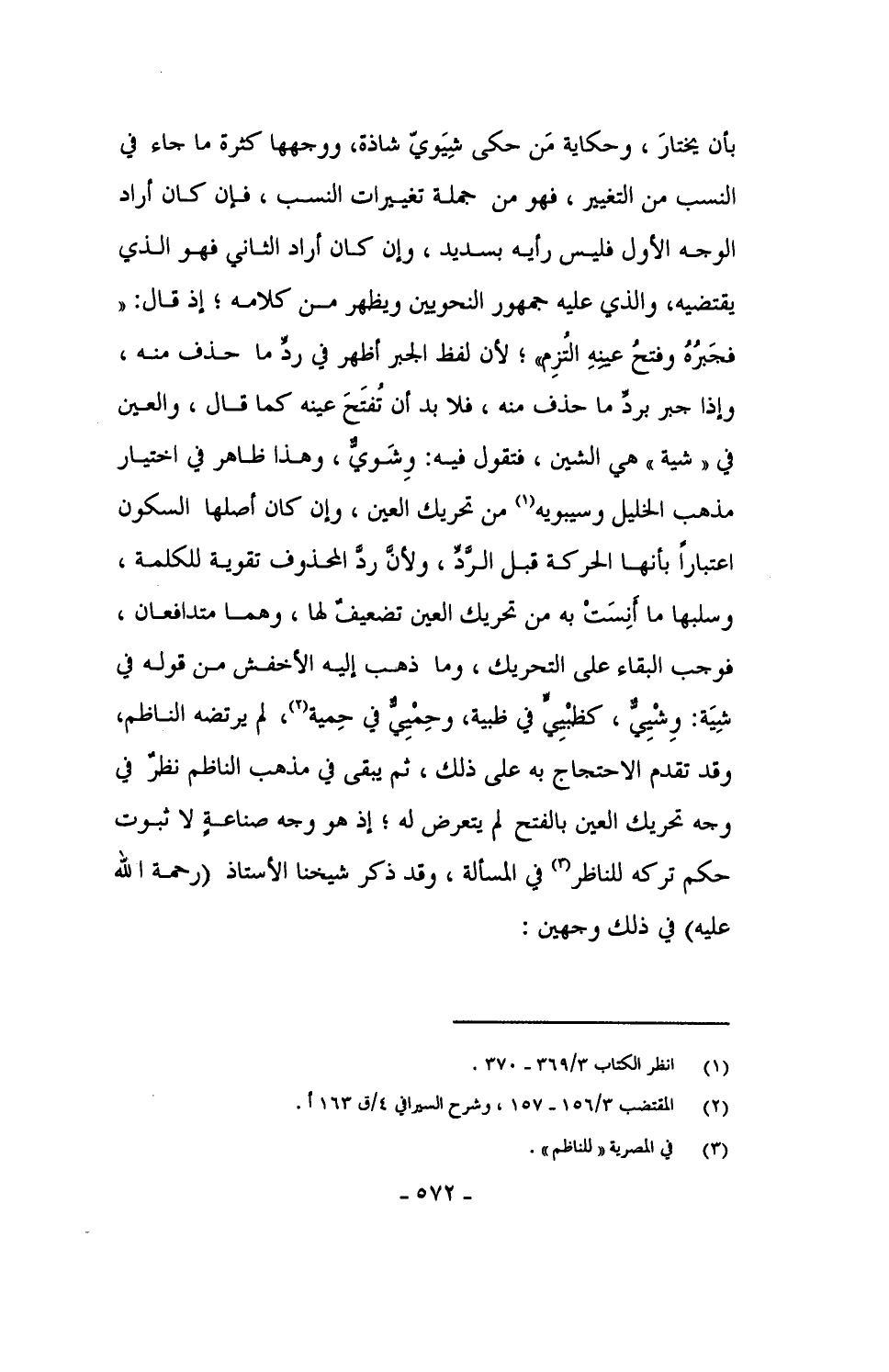 بأن يختارَ، وحكايةَ من حكى شِيَويّ شاذة، ووجهها كثرة ما جاء في النسب من التغيير، فهو من جملة تغييرات النسب، فإن كان أراد الوجه الأول فليس رأيه بسديد، وإن كان أراد الثاني فهو الذي يقتضيه، والذي عليه جمهور النحويين ويظهر من كلامه؛ إذ قال: "فجَبرُهُ وفتحُ عينِهِ التُزِم"؛ لأن لفظ الجبر أظهر في ردِّ ما حذف منه، وإذا جبر بردِّ ما حذف منه، فلا بد أن تُفتَحَ عينه كما قال، والعين في "شية" هي الشين، فتقول فيه: وِشَويٌّ، وهذا ظاهر في اختيار مذهب الخليل وسيبويه من تحريك العين، وإن كان أصلها السكون اعتباراً بأنها الحركة قبل الرد، ولأن ردَّ المحذوف تقوية للكلمة، وسلبها ما أَنِسَتْ به من تحريك العين تضعيفٌ لها، وهما متدافعان، فوجب البقاء على التحريك، وما ذهب إليه الأخفش من قوله في شِيَة: وِشْيِيٌّ، كظبْيِيٍّ في ظبية، وحِمْيِيٌّ في حِمية، لم يرتضه الناظم، وقد تقدم الاحتجاج به على ذلك، ثم يبقى في مذهب الناظم نظرٌ في وجه تحريك العين بالفت لم يتعرض له؛ إذ هو وجه صناعةٍ لا ثبوت حكم تركه للناظر في المسألة، وقد ذكر شيخنا الأستاذ (رحمة الله عليه) في ذلك وجهين: