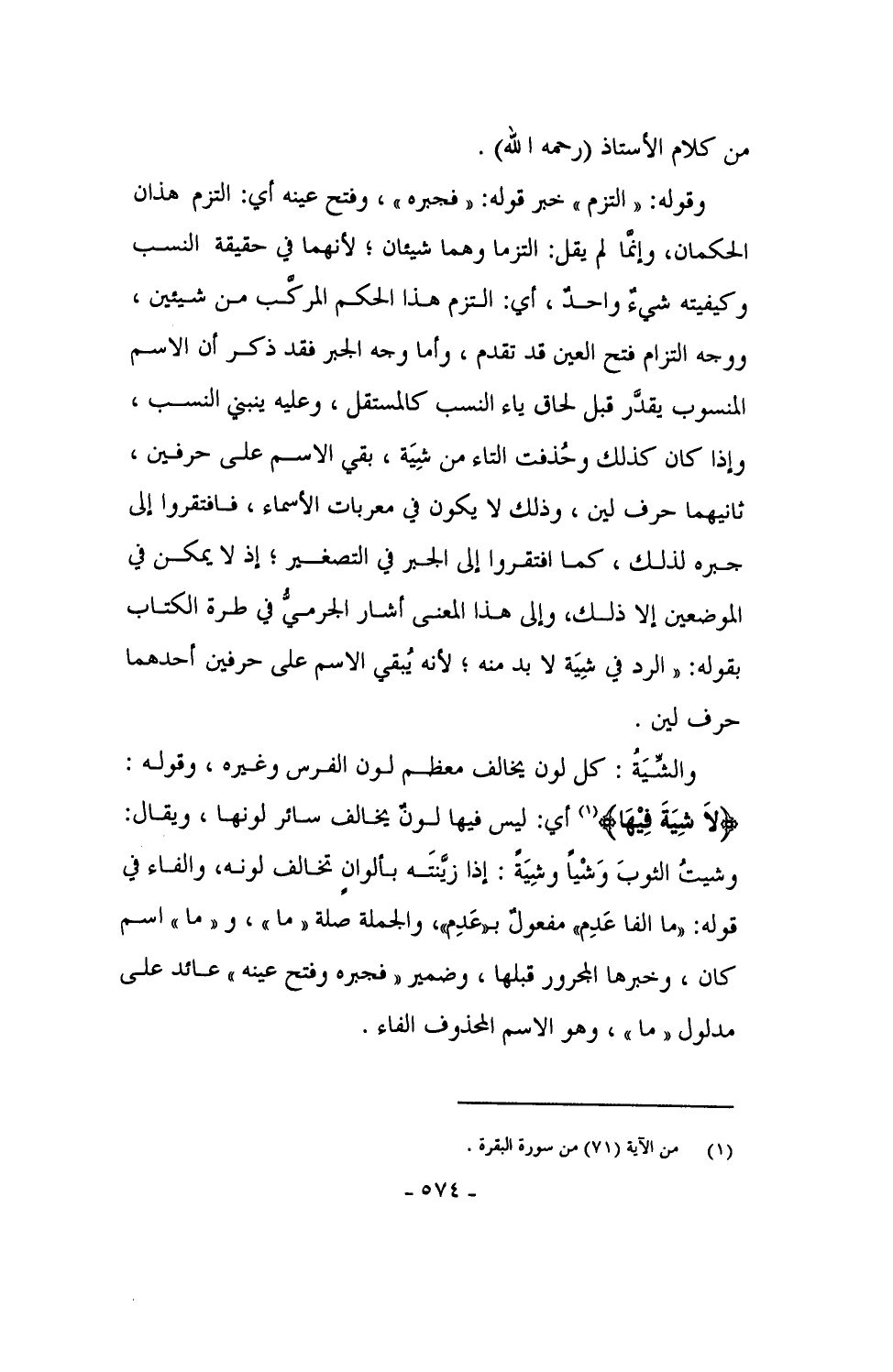 والشِّيَةُ: ل لون يخالف معظم لون الفرس وغيره، وقوله: {لا شِيَةَ فيها} أي: ليس فيها لونٌ يخالف سائر لونها، ويقال وشيتُ الثوبَ وَشْياً وشِيَةً: إذا زيَّنتَه بألوان تخالف لونه، والفاء في قوله: "ما الفا عَدِم" مفعولٌ به بـ"عَدِم" والجملة صلة "ما"، و"ما" اسم كان، وخبرها المجرور قبلها، وضمير "فجبره وفتح عينه" عائد على مدلول "ما"، وهو الاسم المحذوف الفاء.