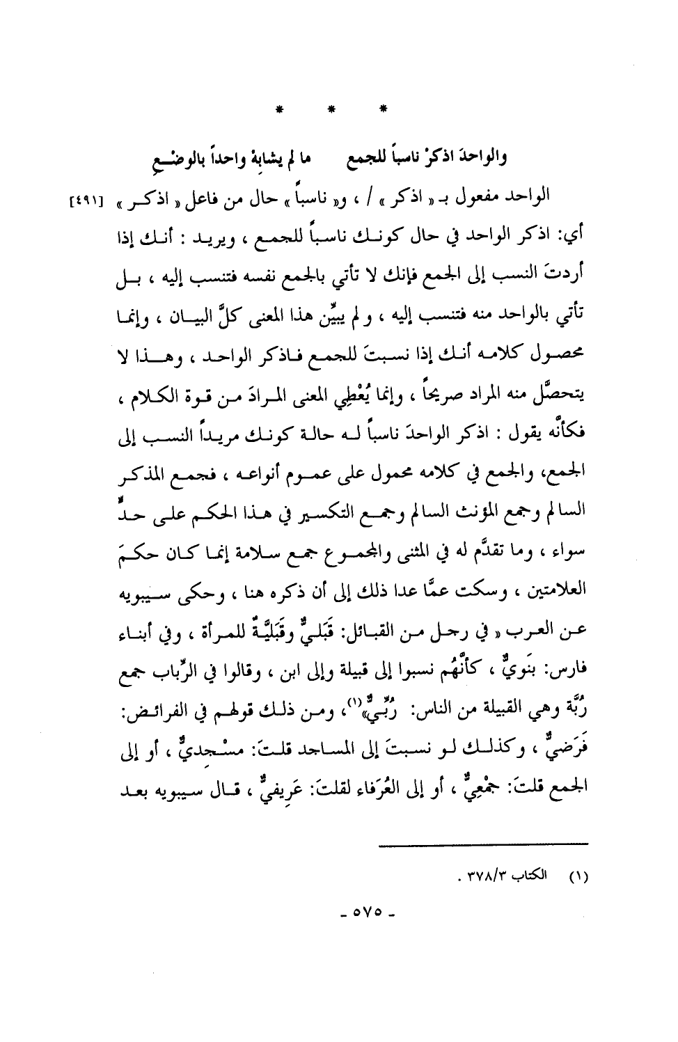 الواحد مفعول بـ"اذكر" /، و"ناسبا" حال من فاعل "اذكر" أي: اذكر الواحد في حال كونك ناسباً للجمع، ويريد: أنك إذا أردتَ النسب إلى الجمع فإنك لا تأتي بالجمع نفسه فتنسب إليه، بل تأتي بالواحد منه فتنسب إليه، ولم يببيِّن هذا المعنى كلَّ البيان، وإنما محصول كلامه أنك إذا نسبتَ للجمع فاذكر الوحد، وهذا لا يتحصَّل منه المراد صريحاً، وإنما يُعْطِي المعنى المرادَ من قوة الكلام، فكأنه يقول: اذكر الواحدَ ناسباً له حالة كونك مريداً النسب إلى الجمع، والجمع في كلامه محمول على عموم أنواعه، فجمع المذكر السالم وجمع المؤنث السالم وجمع التكسير في هذا الحكم على حدٍّ سواء، وما تقدَّم له في المثنى والمجموع جمع سلامة إنما كان حكمَ العلامتين، وسكت عمَّا عدا ذلك إلى أن ذكره هنا، وحكى سيبويه عن العرب "في رجل من القبائي: قَبَليٌّ وقَبَليَّةٌ للمرأة، وفي أبناء فارس: بنَويٌّ، كأنهُم نسبوا إلى قبيلة وإلى ابن، وقالوا في الرِّباب جمع رُبَّة وهي القبيلة من الناس: رُبَِيٌّ"، ومن ذلك قولهم في الفرائض: فَرَضيٌّ، وكذلك لو نسبتَ إلى المساجد قلتَ: مسْجِديٌّ، أو إلى الجمع قلتَ: جمْعِيٌّ، أو إلى العُرَفاء لقلتَ: عَرِيفيٌّ، قال سيبويه بعد