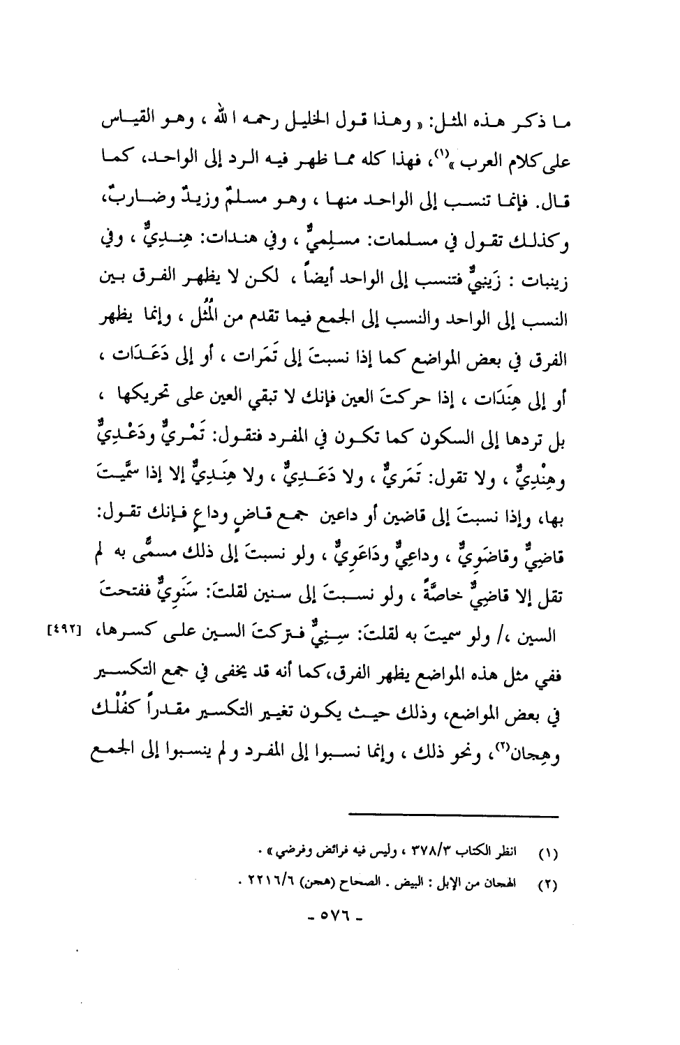 ما ذكره هذه المثل: "وهذا قول الخليل رحمه الله، وهو القياس على كلام العرب"، فهذا كله مما ظهر فيه الرد إلى الواحد كما قال. فإنما تنسب إلى الواحد منها، وهو مسلمٌ وزيدٌ وضاربٌ، وكذلك تقول في مسلمات: مسلِميٌّ، وفي هندات: هِندِيٌّ، وفي زينبات: زَينبيٌّ فتنسب إلى الواحد أيضاً، لكن لا يظهر الفرق بين النسب إلى الواحد والنسب إلى الجمع فيما تقدم من المُثُل، وإنما يظهر الفرق في بعض المواضع كما إذا نسبتَ إلى تَمَرات، أو إلى دَعَدَات، أو إلى هِنَدَات، إذا حركتَ العين فإنك لا تبقي العين على تحريكها، بل تردها إلى السكون كما تكون في المفرد فتقول: تَمْريٌّ ودَعْدِيٌّ وهِنْدِيٌّ، ولا تقول: تَمَريٌّ، ولا دَعَدِيٌّ، ولا هِنَدِيٌّ إلا إذا سميتَ بها، وإذا نسبتَ إلى قاضين أو داعين جمع قاضٍ وداعٍ فإنك تقول: قاضيٌّ وقاضَوِيٌّ، وداعيٌّ ودَاعَوِيٌّ، ولو نسبتَ إلى ذلك مسمًّى به لم تقل إلا قاضيٌّ خاصَّةً، ولو نسبتَ إلى سنين لقلتَ: سَنَويٌّ ففتحتَ السين، / ولو سميتَ به لقلتَ: سِنِيٌّ فتركتَ السين على كسرها، ففي مثل هذه المواضع يظهر الفرق، كما أنه قد يخفى في جمع التكسير في بعض المواضع، وذلك حيث يكون تغيير التكسير مقدراً كفُلْك وهِجان، ونحو ذلك، وإنما نسبوا إلى المفرد ولم ينسبوا إلى الجمع