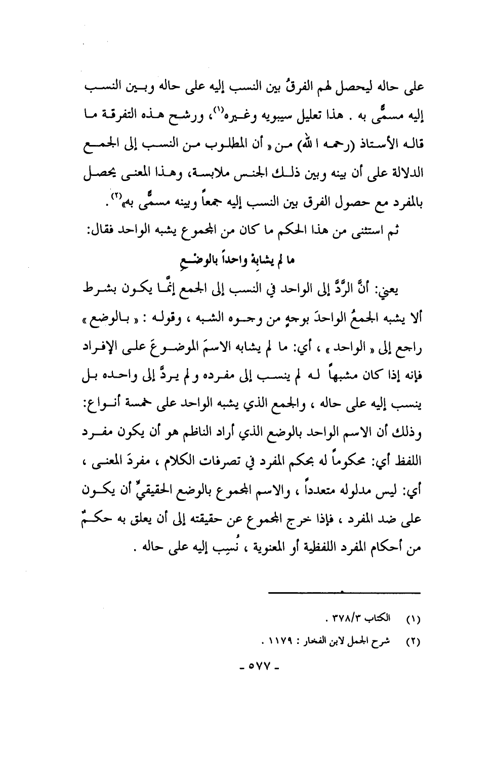 على حاله ليحصل لهم الفرقُ بين النسب إليه على حاله وبين النسب إليه مسمًّى به. هذا تعليل سيبويه وغيره، ورشح هذه التفرقة مما قاله الأستاذ (رحمه الله) من "أن المطلوب من النسب إلى الجمع الدلالة على أنه بينه وبين ذلك الجنس ملابسة، وهذا المعنى يحصل بالمفرد مع حصول الفرق بين النسب إليه جمعاً وبينه مسمًّى به".