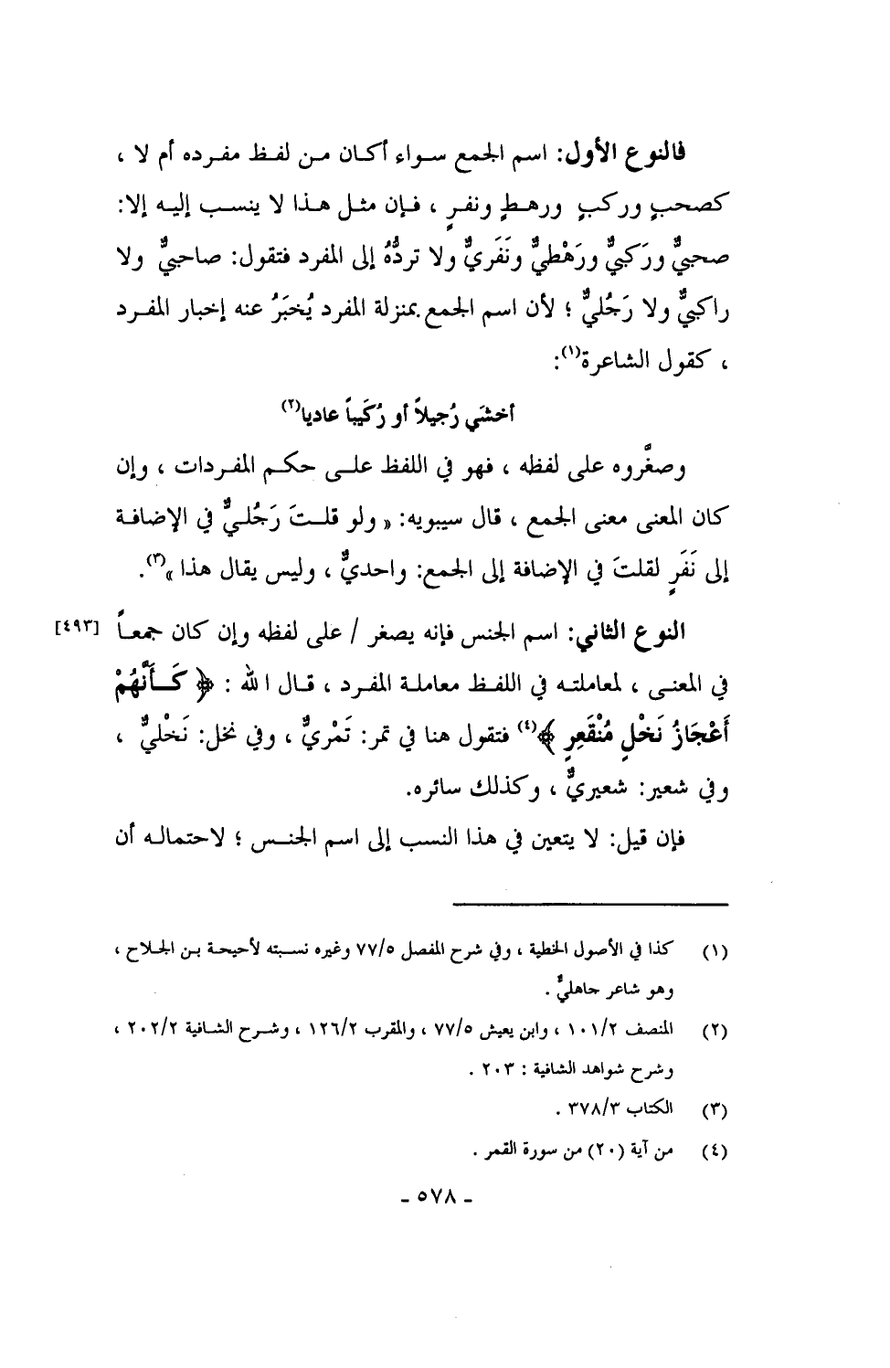 فالنوع الأول: اس الجمع سواء أكان من لفظ مفرده أم لا، كصحبٍ وركبٍ ورهطٍ ونفرٍ، فإن مثل هذا لا تنسب إليه إلا: صحبيٌّ ورَكبيٌّ ورَهْطيٌّ ونَفَريٌّ ولا تردُّهُ إلى المفرد فتقول: صاحبيٌّ ولا راكبيٌّ ولا رَجُليٌّ؛ لأن اسم الجمع بمنزلة المفرد يُخبَرُ عنه إخبار المفرد، كقول الشاعرة: