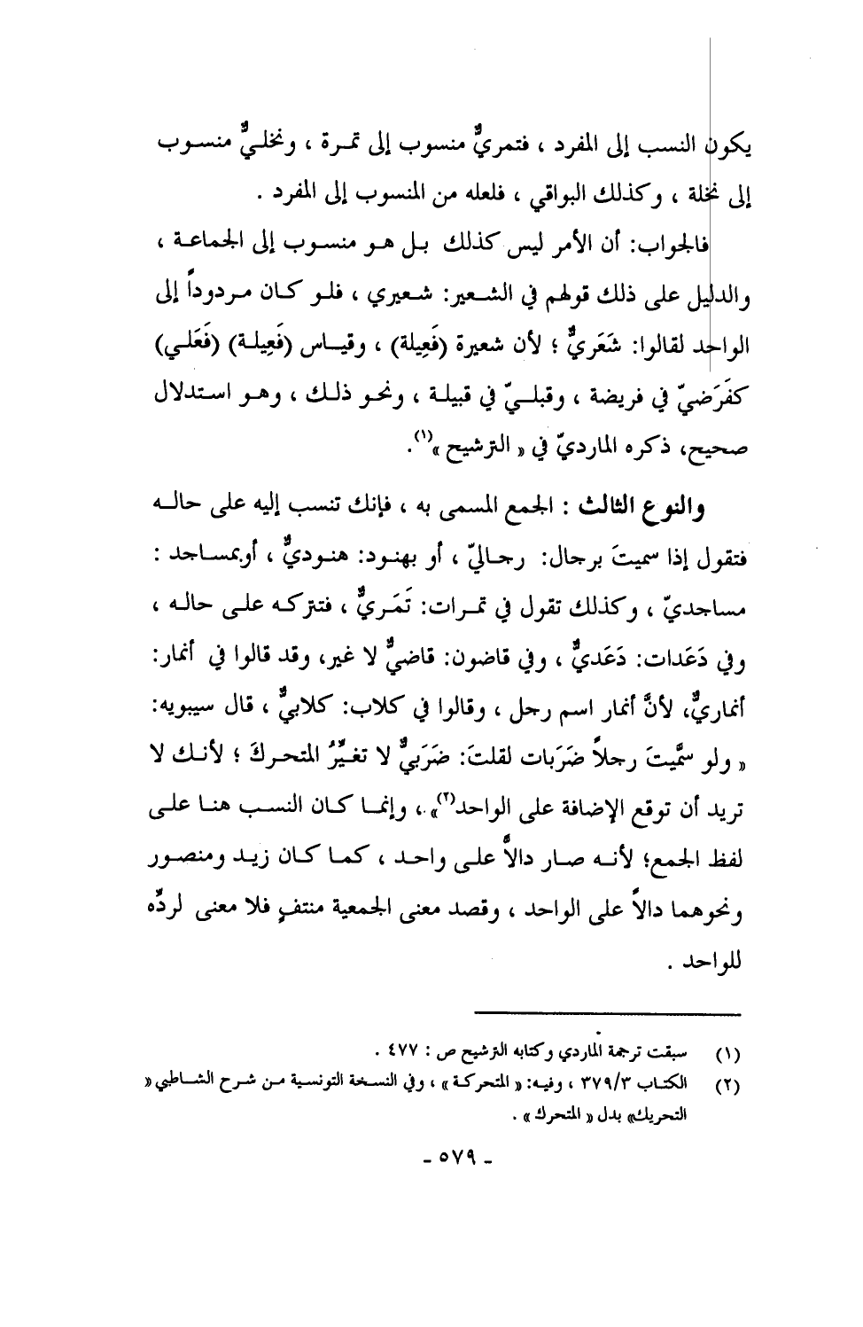 فالجواب: أن الأمر ليس كذلك بل هو منسوب إلى الجماعة، والدليل على ذلك قولهم في الشعير: شعيري، فلو كان مردوداً إلى الواحد لقالوا: شَعَريٌّ؛ لأن شعيرة (فَعِيلة)، وقياس (فَعِيلة) (فَعَلي) كفَرَضيّ في فريضة، وقبليّ في قبيلة، ونحو ذلك، وهو استدلال صحيح، ذكره المارديّ في "الترشيح".