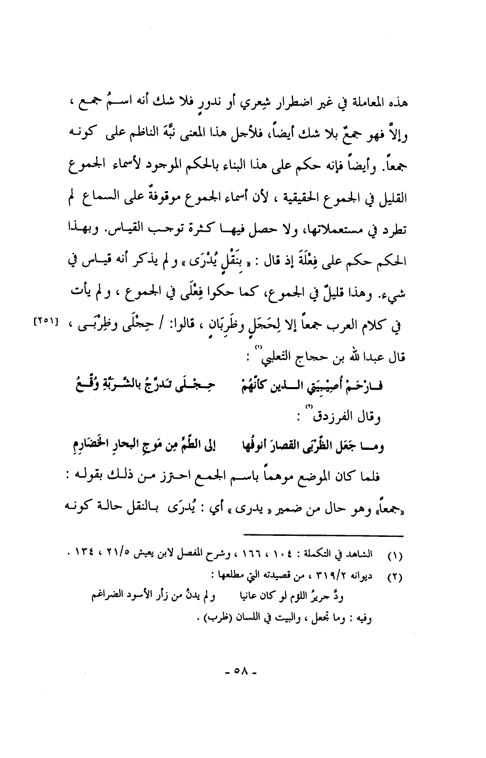 هذه المعاملة في غير اضطرار شعري أو ندور فلا شك أنه اسم جمع، وإلا فهو جمع بلا شك أيضاً، فلأجل هذا المعنى نبه الناظم على كونه جمعاً. وأيضاً فإنه حكم على هذا البناء بالحكم الموجود لأسماء الجموع القليل في الجموع الحقيقية، لأن أسماء الجموع موقوفة على السماع لم تطرد في مستعملاتها، ولا حصل فيها كثرة توجب القياس. وبهذا الحكم حكم على فِعْلَةَ إذ قال: "بنقلٍ يُدرى" ولم يذكر أنه قياس في شيء. وهذا قليل في الجموع، كما حكوا فِعْلَى في الجموع، ولم يأت في كلام العرب جمعاً إلا لِحَجَلٍ وظَرِبَانٍ، قالوا: / حِجْلَى وظِرْبَى، قال عبد الله بن حجاج الثعلبي: