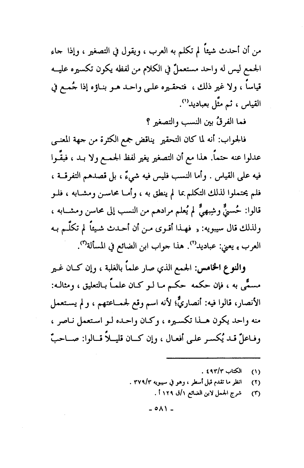فالجواب: أنه لما كان التحقير يناقض جمع الكثرة من جهة المعنى عدلوا عنه حتماً. هذا مع أن التصغير يغير لفظ الجمع ولا بد، فبقَّوا فيه على القياس. وأما النسب فليس فيه شيءٌ، بل قصدهم التفرقة، فلم يحتملوا لذل التكلم بما لم ينطق به، وأما محاسن ومشابه، فلو قالوا: حُسنيٌّ وشِبهيٌّ لم يُعلم مرادهم من النسب إلى محاسن ومشابه، ولذلك قال سيبويه: "فهذا أقوى من أن أحد شيئاً لم تكلَّم به العرب" يعني: عباديد. هذا جواب ابن الضائع في المسألة.